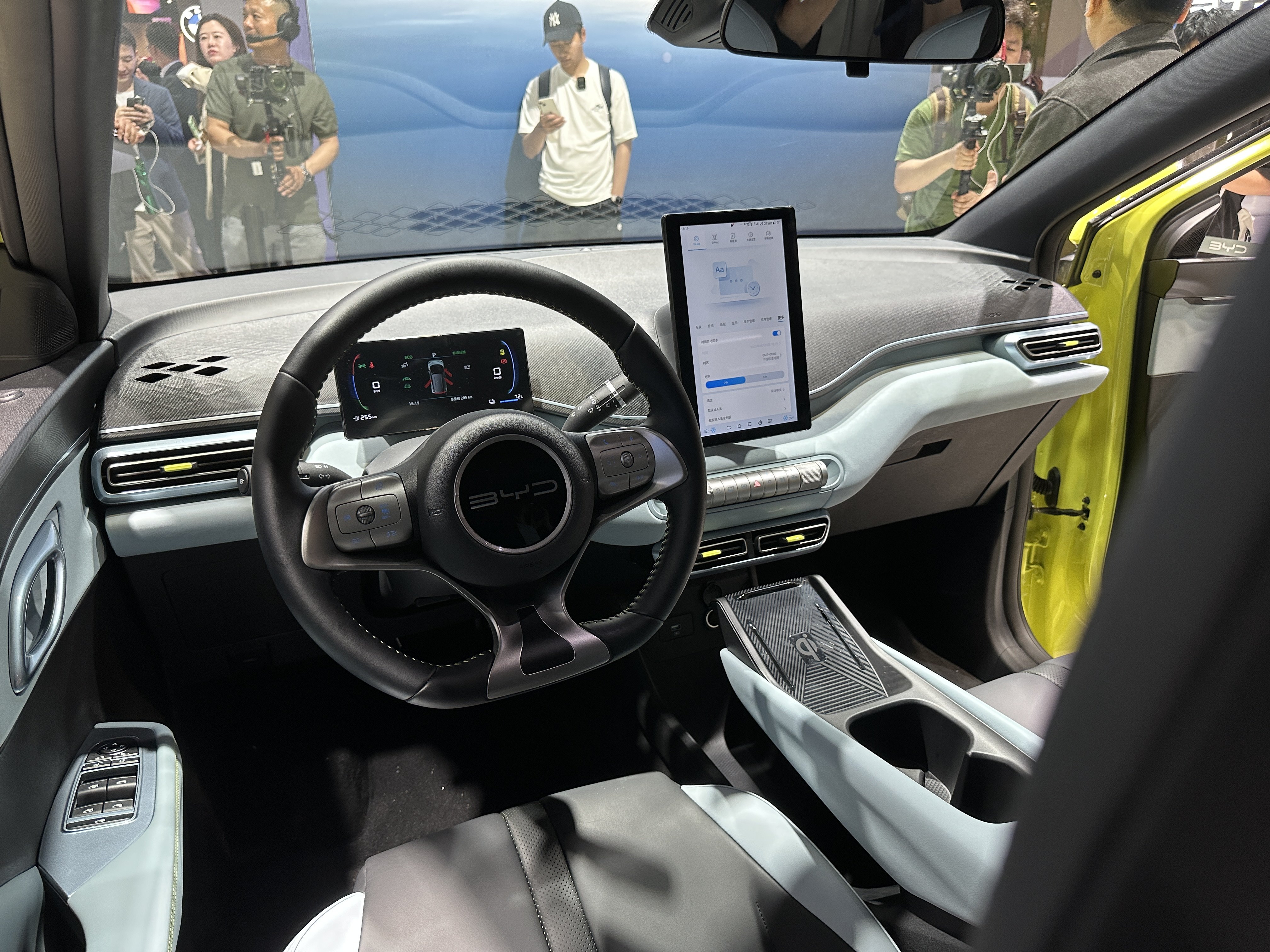 进入车内后,海鸥会给你一种熟悉感,内饰造型有很多海豚的设计,这种设计下放在车圈也是常态了。最明显就是方向盘、中控屏以及下方那一排实体按键了。