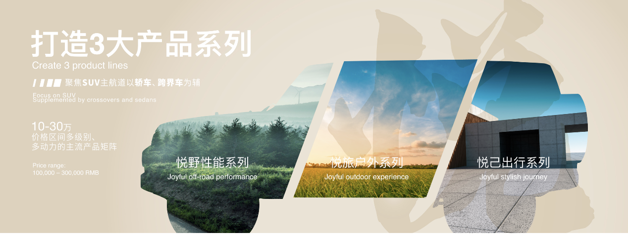 其二,是重新梳理三大系列产品布局。即聚焦SUV主航道,以轿车、跨界车为辅助,推出10万-30万价格区间,包含多元级别、多元动力的主流产品矩阵。悦野性能系列,定位硬核可靠、全域无畏、军工品质、性能伙伴,吸引向往自由、真我、探索的用户。悦旅户外系列,定位游刃无界、智享互联、硬派时尚、多元功能,吸引热爱智驾、潮玩、时尚的用户。悦己出行系列,定位力量美学、潮酷引领、享乐玩家、国潮先锋,吸引崇尚年轻、务实、率真的用户。