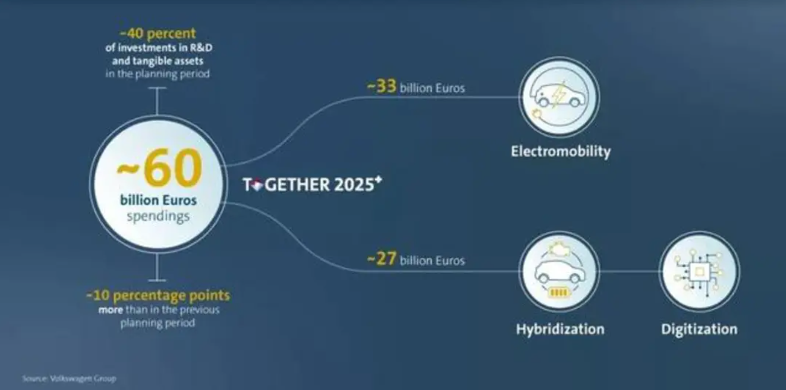 2019年,大众在2020-2024年的五年投资计划时就宣布,大众将在这5年时间内投资600亿欧元(约4646以元人民币),其中330亿欧元用来发展纯电技术,剩下的270亿欧元则由于混动车和数字化领域的研发。