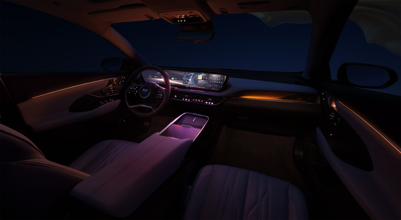 从这张图可以看到全新一代君越内饰的“纯粹风”——线条简洁明快,空间轻盈通透,是全新别克标志性的“纯粹”设计语言。其中,30吋一体式6k高清曲面屏是别克全新一代VCS智能座舱的标配;连同多功能方向盘、个性鲜明的中控台等,整体上复刻并延伸了别克世纪的风格,这些也显示出全新一代君越“更智能,更高端”的豪华基调。