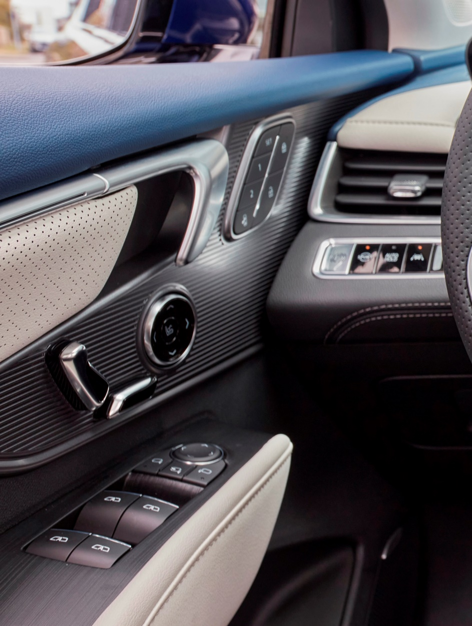 主驾门板要素同样不少:回旋镖形门拉手新颖精致,门板内饰甚至用上了打孔皮革,拉丝纹理配合电镀饰条,凸显细腻精致。门板座椅电动调节键与别克世纪和奔驰同款,旁边的圆形键集成了电动腰托和座椅通风调节,门把手前方还有2挡座椅记忆和车门解锁落锁按键等,配置相当豪华。