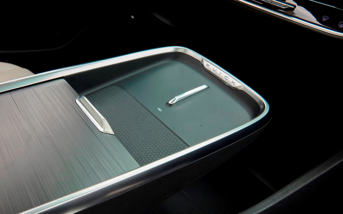 中控台设计新颖,悬浮式设计带有科幻感,镀铬饰边加上别克字母刻标以及拉丝盖板,很显档次。标识显示,此处为手机无线充电区域。