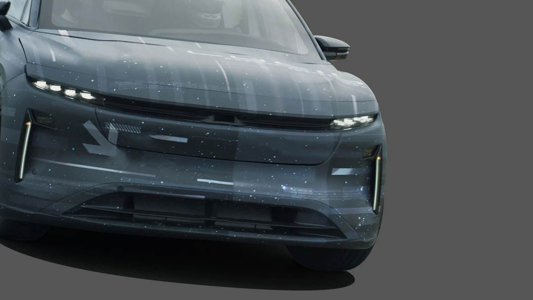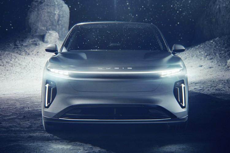 从曝光谍照来看,新车基本延续此前官图造型,即采用与首款车型Lucid Air一致的家族设计语言,以修长的黑化饰条与两侧灯组形成贯穿式造型,并搭配分体式灯组,下方加入进气口设计,酷似拉伸后的Lucid Air,而其造型被戏称“北美小鹏汽车”。