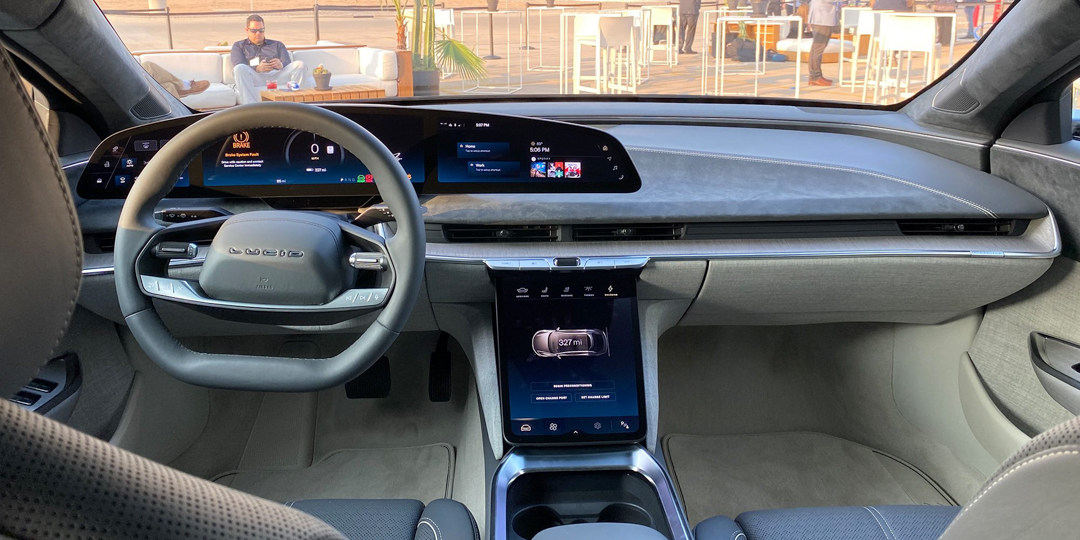 至于中控造型官方并未公布,但大概率会与Lucid Air相似,作为参考,Lucid Air采用的是一体化悬浮屏搭配下方操作屏形成双屏互联,科技感与简洁感都得到体现。