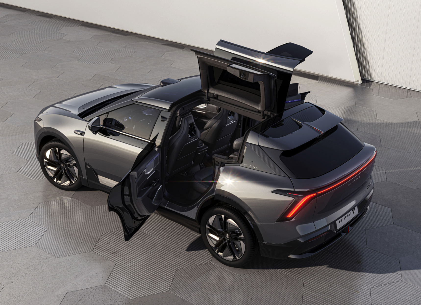 反之来到HiPhi Y身上,新车同样没有配备传统门把手,而是采用触控按键的开门方式,同时选择了展翼式车门设计,不过没有像HiPhi X那样进一步使用对开门的方案,这点取舍多少可以看出其降本的考虑。