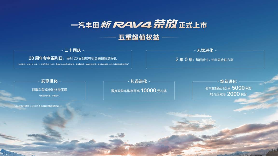 挚爱20载,深情礼遇,为回馈广大用户的支持与热爱,一汽丰田新RAV4荣放带来了5重超值权益,让用户轻松感受“全能超进化”的出行生活。5重权益分别为:①二十同庆:20周专享福利日,每月20日到店,有机会获得盲盒好礼;②无忧进化:2年0息,超低首付/长年限金融方案;③安享进化:双擎车型享电池终身质保;④礼遇进化:置换双擎车型享至高10000元礼遇;⑤焕新进化:老车主换新升级享5000积分,转介绍双享2000积分。