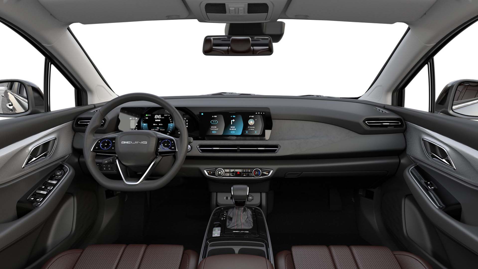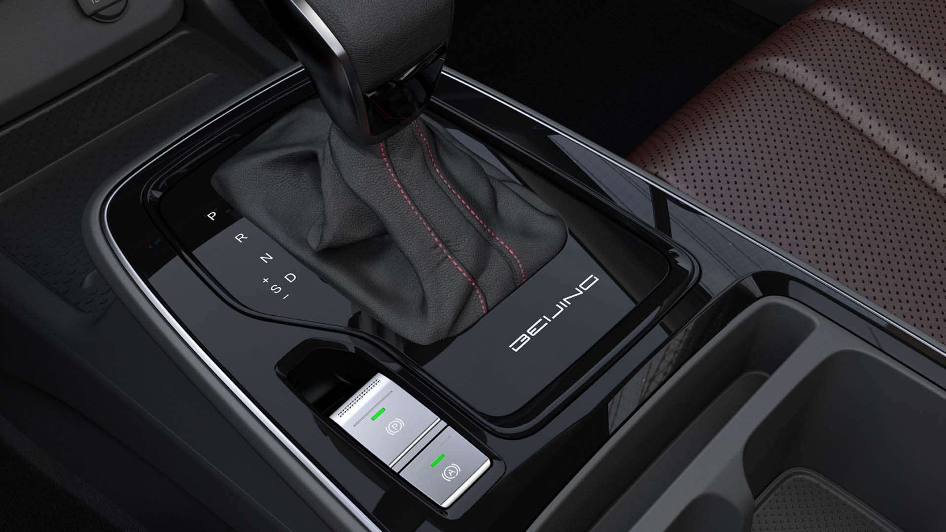 整车的造型与以往的车型设计没有太大变化,只在细节方面上进行了调整。外观上依旧采用北京品牌的家族式前格栅造型,汲取大致美设计理念。前脸上采用上下分体式格栅造型,上方为窄条幅式镀铬饰条,并连接两侧的大灯组,有点时下流行的贯穿式设计。下半采用大尺寸多边形前进气格栅,并在内部加入点阵式元素装饰,左右两侧还有像回旋镖似的进气口装饰,让整车看上去十分时尚且运动。