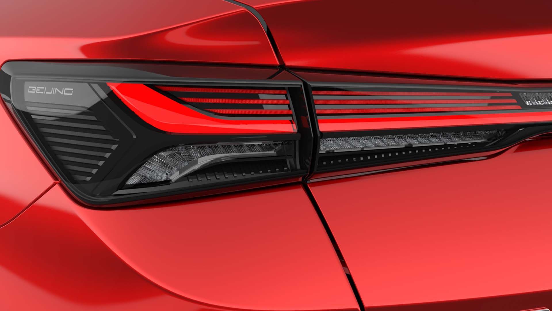 车尾部分采用了采用了贯穿式尾灯组的设计,灯罩部分还做了熏黑式设计,提升了整车的运动感。同时搭配上方的BEIJING品牌的LOGO,拉长了车尾的视觉效果。此外,在后包围的两侧,有两个C字形灯带,与车头的设计相呼应,整车的协调性增强,辨识度也得到提高。