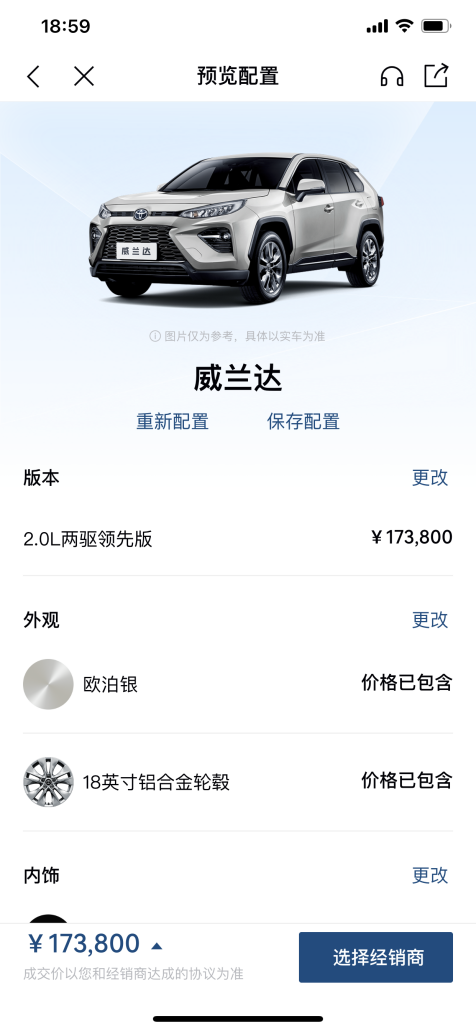 与此同时,为保证每一位消费者的权益,广汽丰田还支持在官方APP丰云行上进行新车下订,提供公开、透明的价格体系。不仅价格优惠一目了然,线上下订立享优惠,并且