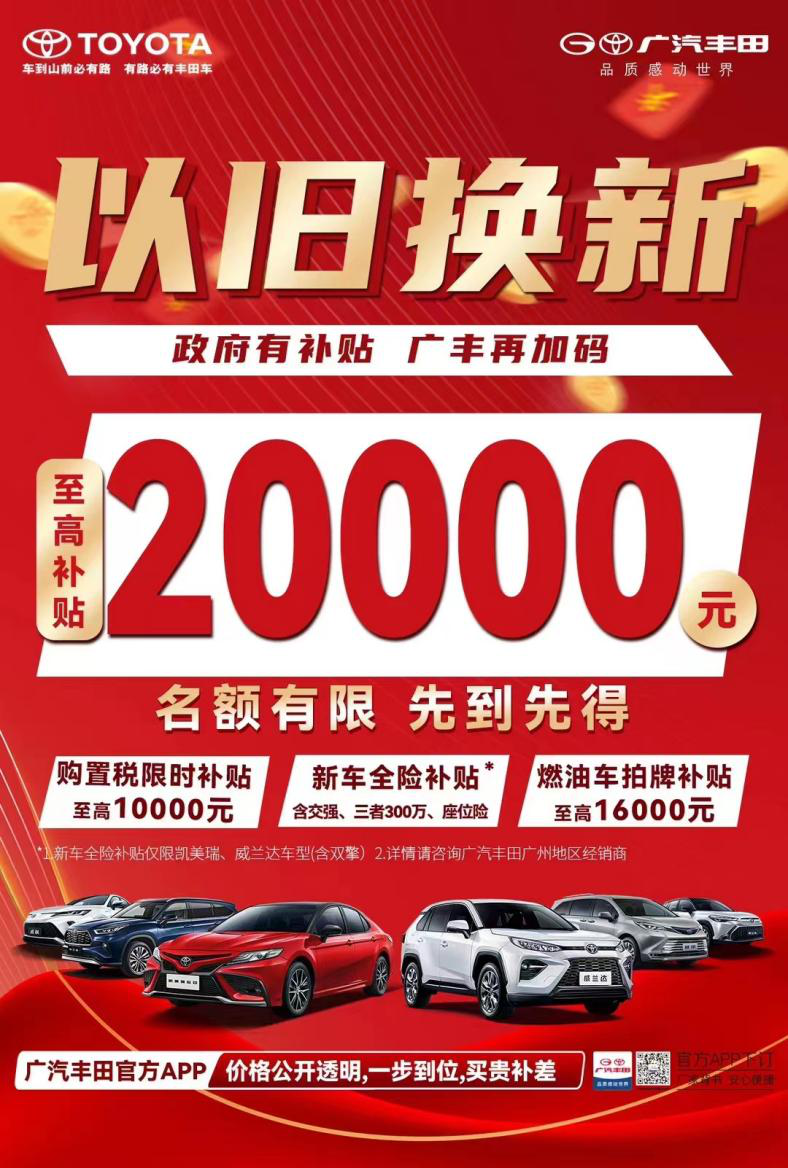 即日起至5月31日,消费者购买广汽丰田旗下凯美瑞、威兰达、雷凌、威飒和锋兰达,以及前4款车型的智能电混双擎版,即可享包含至高20000的置换补贴(含广州市政府以旧换新补贴),厂家为消费者提供至高10000元的购置税限时补贴,至高16000元的燃油车拍牌补贴,1元送全车保险(新车全险补贴仅限凯美瑞、威兰达车型)的官方补贴让利。