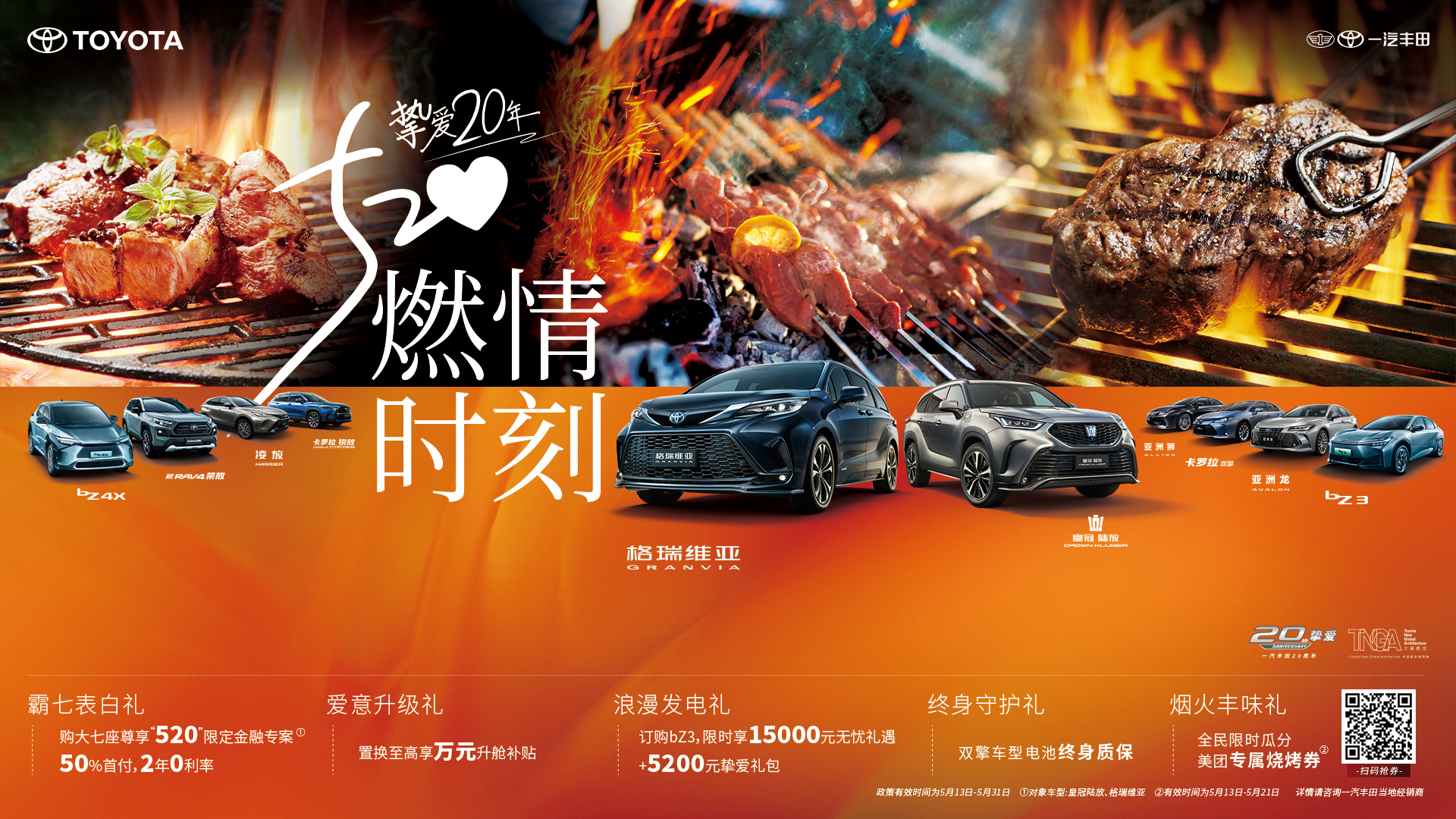 五月榴花照眼明,枝间时见子初成。在这个绿荫艳阳的季节,一场淄博烧烤让宵夜江湖的烟火气飘遍了大江南北。正值“20周年感恩季”,5月13-21日,一汽丰田开展了“挚爱20年 520燃情时刻”系列营销节活动,用热辣鲜香的烧烤点燃了万千粉丝的热情。其间,一汽丰田联合头部生活平台美团和大众点评,利用优势资源随机派发总计20万元最高880元烧烤礼包,并分别在北京、海口、长沙、贵阳和徐州五大城市联合打造专属烧烤主题Party,邀请淄博烧烤大厨空降现场,让“小饼配香葱,木炭惹香风”的地道美食突破时空的界限,让“皮脆肉更嫩,酱香汁更美”的绝佳口感激活到场嘉宾的味蕾。此外,一汽丰田还将在全国10个城市,开展20场烧烤盛宴,用最热烈的人间烟火气,与用户和粉丝们共创最难忘的燃情时刻。