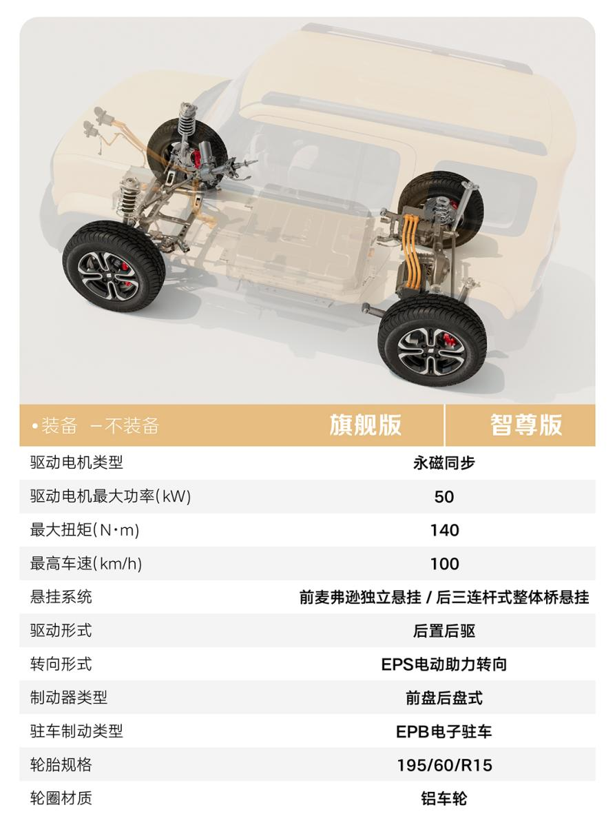 在动力续航上,宝骏悦也搭载永磁同步电机,最大功率为50kW,最大扭矩140N•m,带来畅快起步、强劲提速的动力表现。新车拥有硬派风格底盘调校,标配麦弗逊独立前悬架和三连杆式整体桥后悬架,并采用后置后驱布置,为城市玩家带来更畅快、更愉悦的驾控体验。