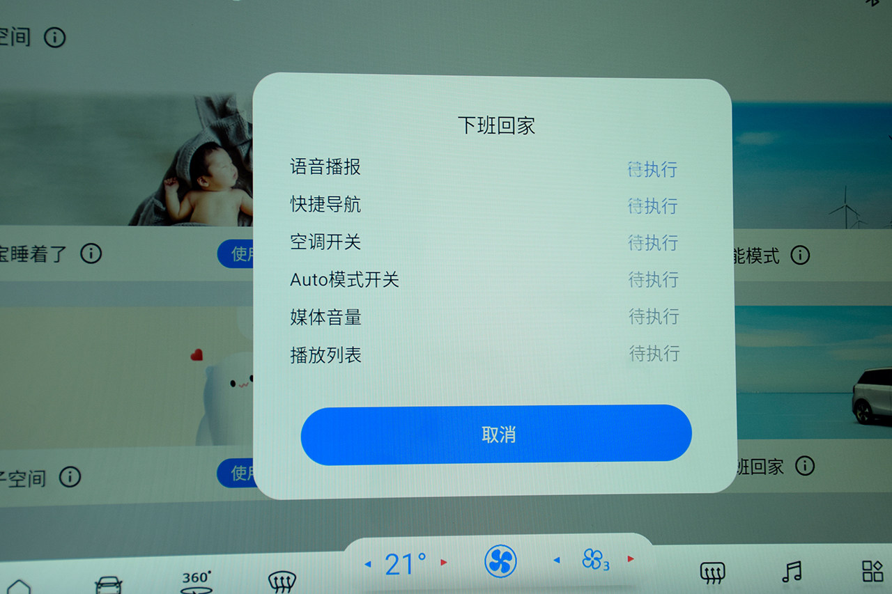 车机系统里面有个比较好玩的“场景”,比如有宝宝睡着了、亲子空间、下班回家等,选择不同的模式,车辆会自动调整语音播报、快捷导航、空调开关、媒体音量、音乐列表等,比如选择这个“下班回家”,车辆就自动导航到家,并且播放很欢快的音乐类型……