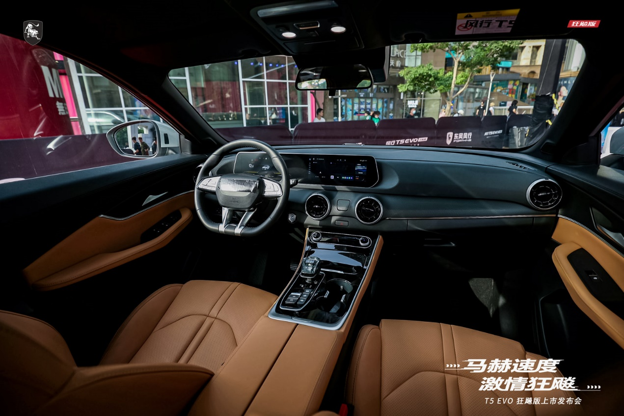 风行T5 EVO狂飚版的内饰设计采用了棕色方案内饰配色(可选配黑+黄),搭配上一体式运动座椅,豪华感和运动感兼具。环抱式中控、桥型副仪表台、智慧双连屏、触摸式空调控制面板等,极富科技感与豪华感;超强主驾座椅、多功能电动座椅、豪华麂皮材质内饰用料、弗吉亚Dragon平台骨架等,所触皆是豪华;L3级低气味环保座舱,让用户畅享“呼吸自由”;私享澎湃音效和图书馆级37分贝静谧空间,则为用户创造了一个更加舒适、惬意的驾乘环境。