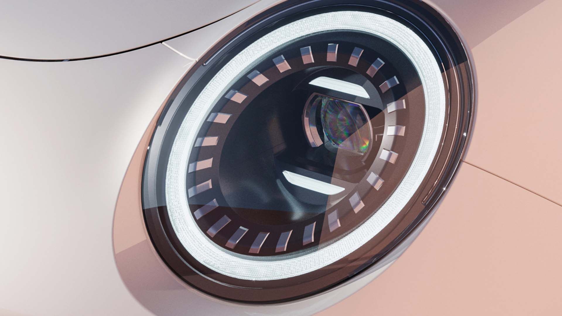这种“泡泡”元素在钇为3身上随处可见,前脸采用了复古的风格,“天使之眼”造型的前大灯,内嵌137颗LED灯珠,中间透镜上下各还有一个横向灯带,加上熏黑的外圈装饰以及24个宛如睫毛一样的柱形灯条,看起来精致感十足。有意思的是,这颗“天使之眼”在解锁、锁定、充电、停车时均有相对应的眨眼动效。大灯的位置还略高于中间的机盖,营造出不错的运动效果。下包围的配有大面积的黑色饰板像个嘴巴一样。