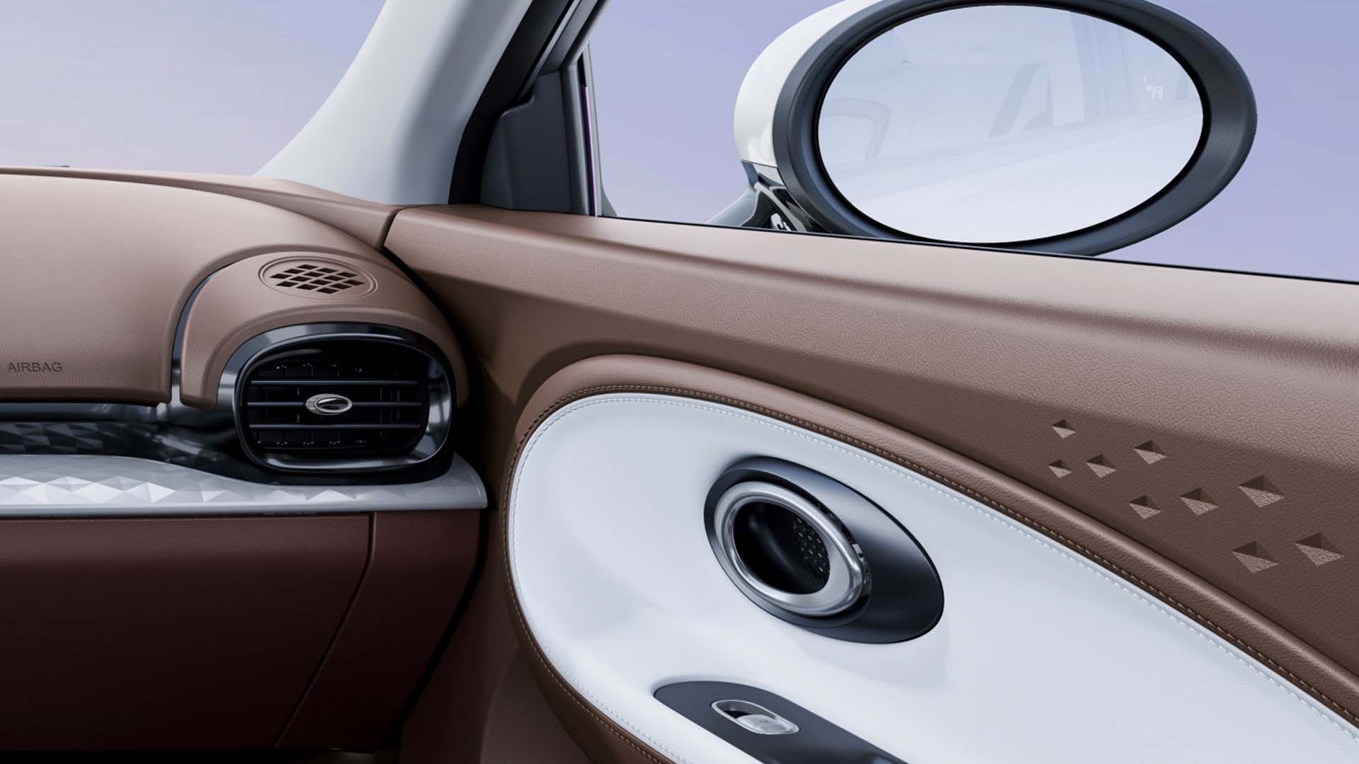 车身侧面造型简洁流畅,采用了上下拼色的设计,上半黑色下半米黄色,显得车身更加娇小玲珑。细节方面,采用了黑化圆形外后视镜、隐藏式车门和五辐花瓣状轮毂,配备手机蓝牙钥匙,车辆的充电接口位于左前翼子板处。