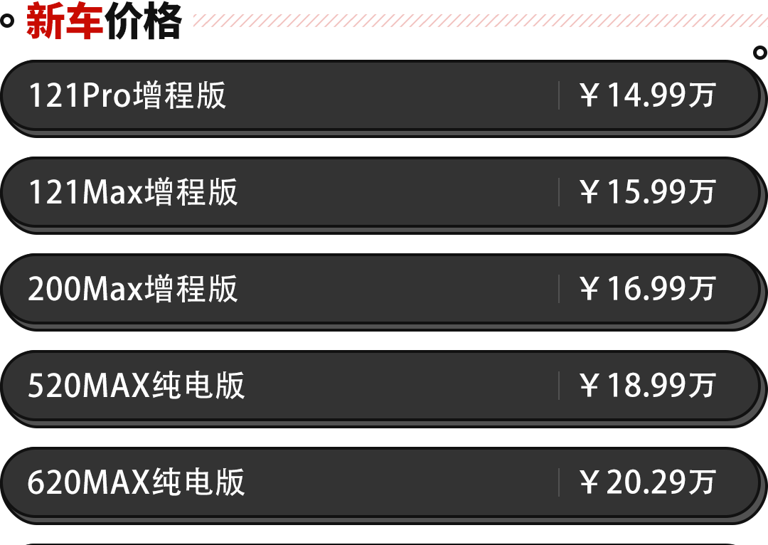 续航方面,纯电版CLTC工况续航里程分别为520公里与620公里,官方公布的纯电版电耗最低14.2千瓦时/100公里(CLTC);而增程版CLTC工况续航里程有121公里和200公里,两种动力综合油耗对应1.29L/百公里、0.68L/百公里。