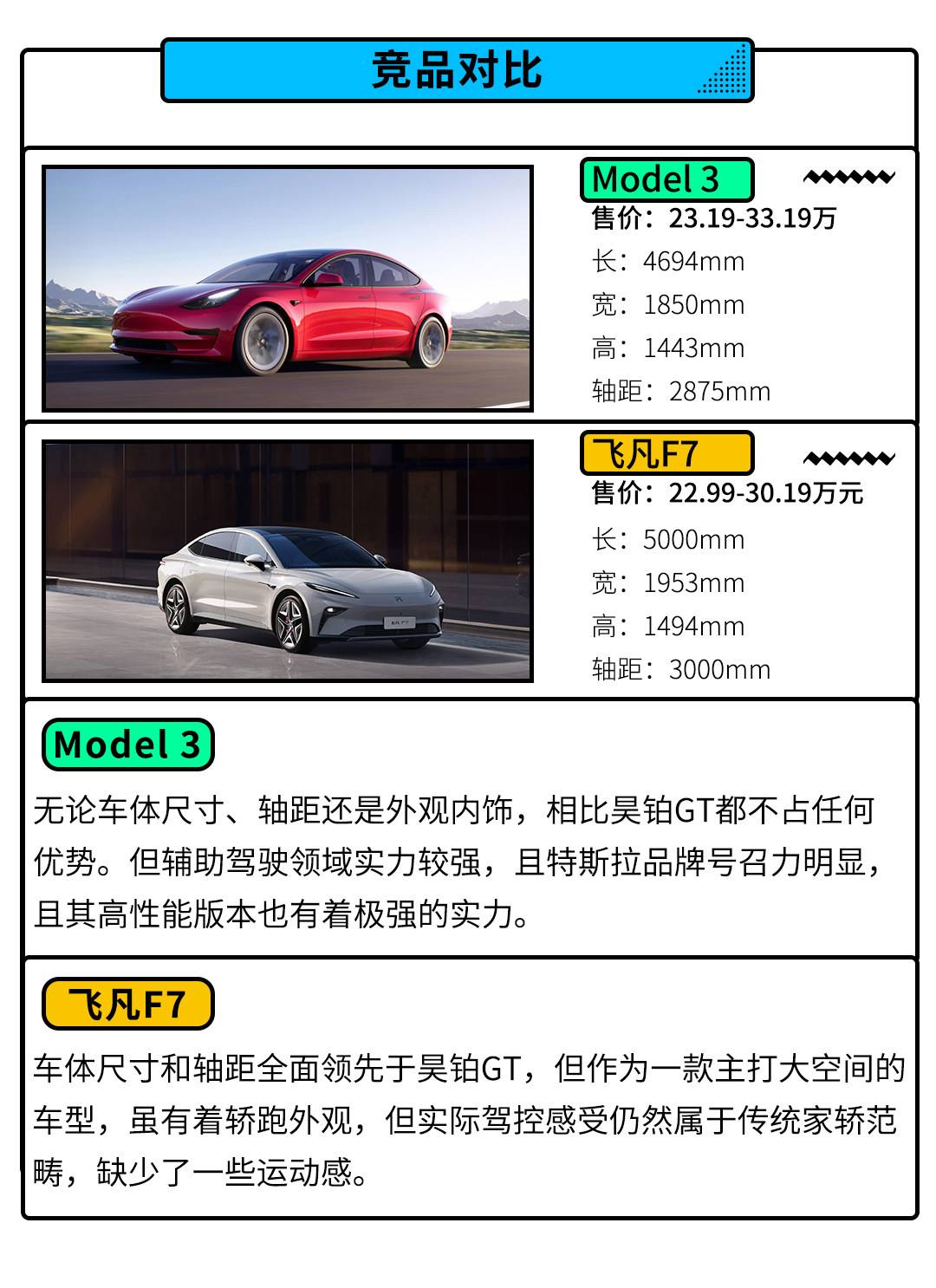 昊铂GT作为一种主打差异化的产品,实际上明确对标的竞品不算多,飞凡F7是它最明显的对手,哪吒GT虽然是台跑车(哪吒GT其实更接近轿跑的定义),但从性质上也能算它的对手之一。
