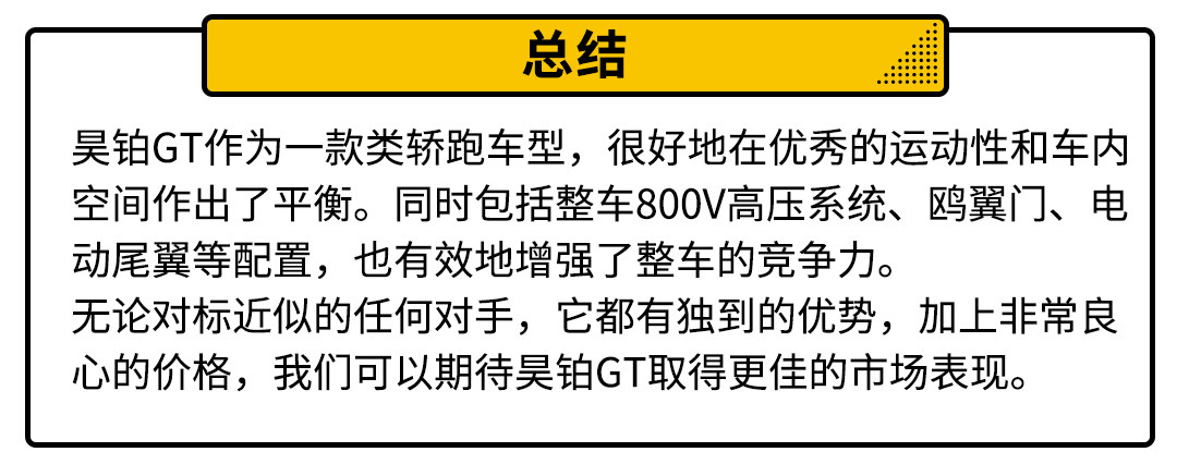 不过不管如何,昊铂GT无论从产品力还是价格上,对于当前纯电车市场是有震撼性的。它尽管属于差异化车款,但无论对标近似的任何对手,它都有独到的优势,加上非常良心的价格,我们可以期待昊铂GT取得更佳的市场表现。