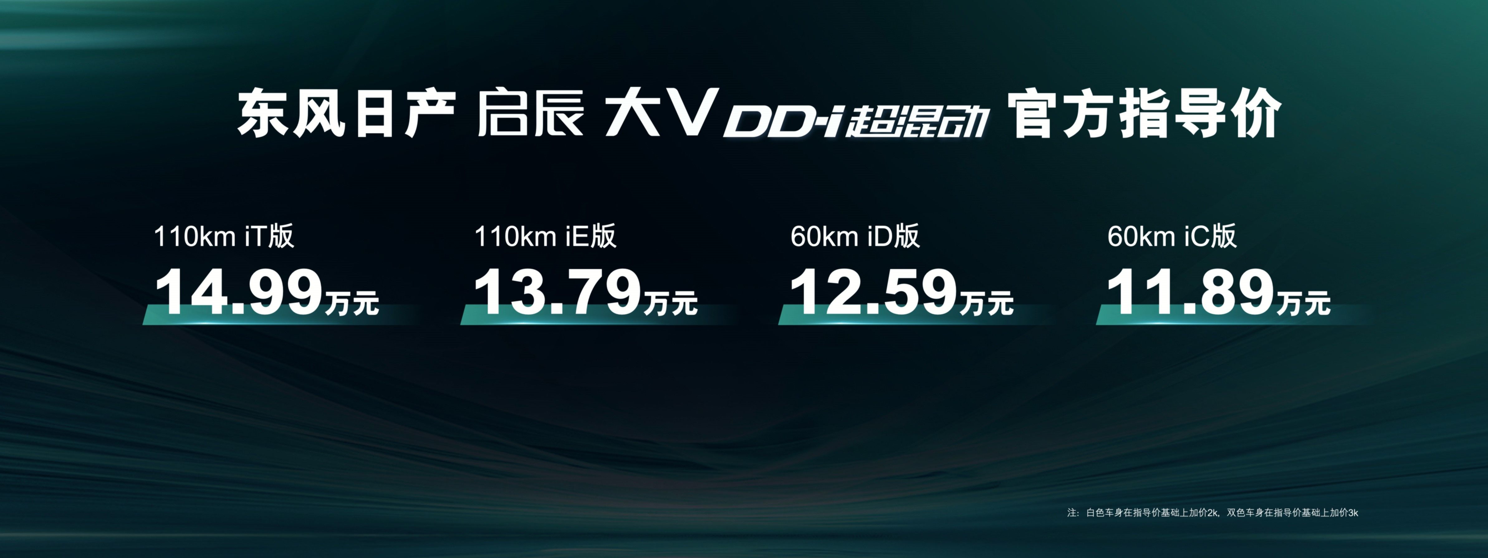 启辰大V DD-i超混动上市了四款车型,两款60km版本和两款110km版本,售价区间在11.89-14.99万。