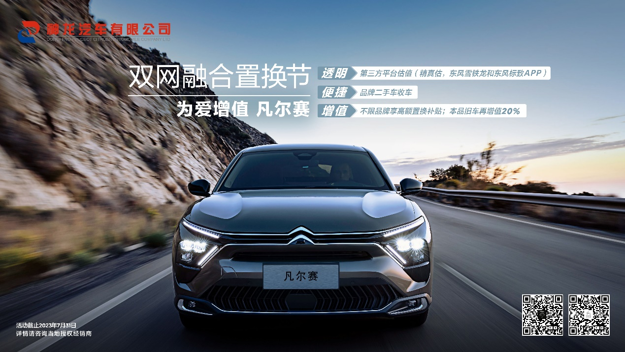 不仅如此,神龙汽车还开启了双网融合置换节,给客户打造一个透明、便捷又省心的换购环境。即日起至7月31日,换购凡尔赛C5 X不限品牌享高额置换补贴,东风雪铁龙、东风标致品牌车型还可再增值20%。客户只需通过东风雪铁龙、东风标致APP进行第三方平台估值,获取旧车精准、真实的估值报价,便可交由品牌二手车收车,省去了东奔西走的卖车烦恼。(详情请咨询当地授权经销商)