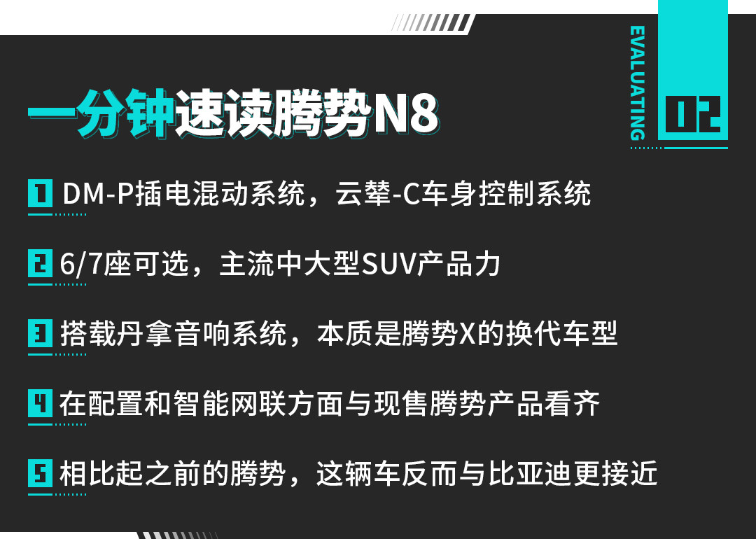 腾势N8把“主流中大型SUV”所需的要素点满,这辆车和之前的腾势完全走的不是一条路,它并不极致,集合了市场中大型SUV各家得到消费者认可的要素在加上比亚迪自身的技术积淀,就是这个样子。目前腾势内部已经放出消息:N8将在三季度内上市,预计30万左右起售。各位可以查下现售比亚迪唐DM-P的指导价,事情是不是一下有趣了起来?