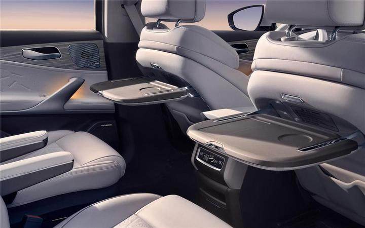 腾势N8中控屏内置的车机系统和腾势D9一致,下方还提供了手机无线充电功能,副仪表台采用了一体式触控面板,用料上不再采用可以留下指纹的钢琴烤漆。第二排配备了双航空桌板(带卡槽位),D9上的功能触控屏在N8上被移植到中间空调出风口区域。还有一点教授也很惊讶:腾势N8配备的是丹拿音响,而不是此前在N7上大张旗鼓宣传的帝瓦雷。