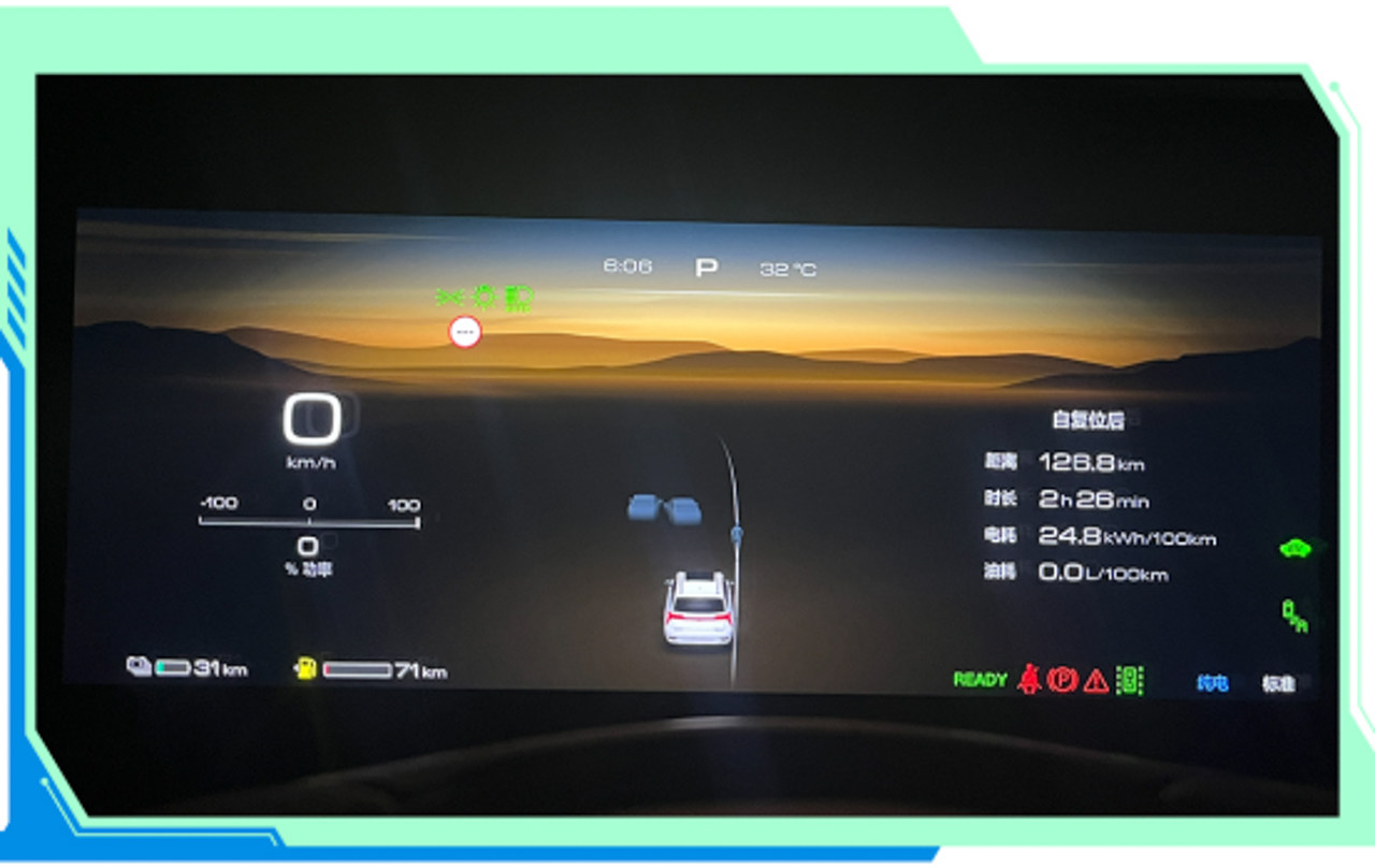 出发前蓝山DHT-PHEV油表亮起了警示灯,在没油的情况下能够最大限度保持纯电状态行驶,将电量充至“跳枪”后仪表显示续航里程176公里,驾驶模式选择标准,动能回收为中档,空调23度2档风,车内成员3人,开始本次测试。