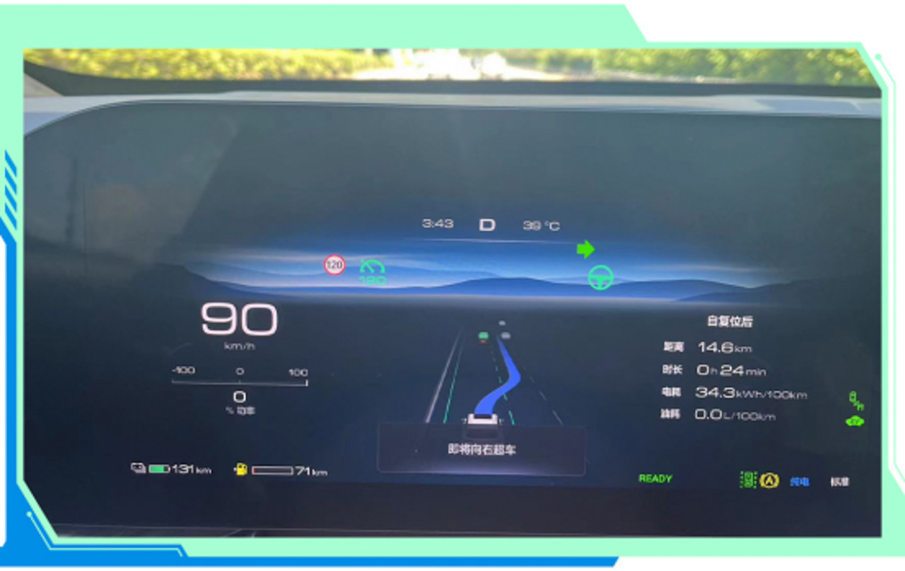 蓝山DHT-PHEV自动变道的逻辑较为温柔,在识别到后车距离后判断要不要变道时有些犹豫不决,好在能够根据导航提前几公里变到合适车道,但是在车流较大时最好是驾驶员接管,毕竟目前市面上的新能源车型应对这一个工况,大家的表现都没有很突出。