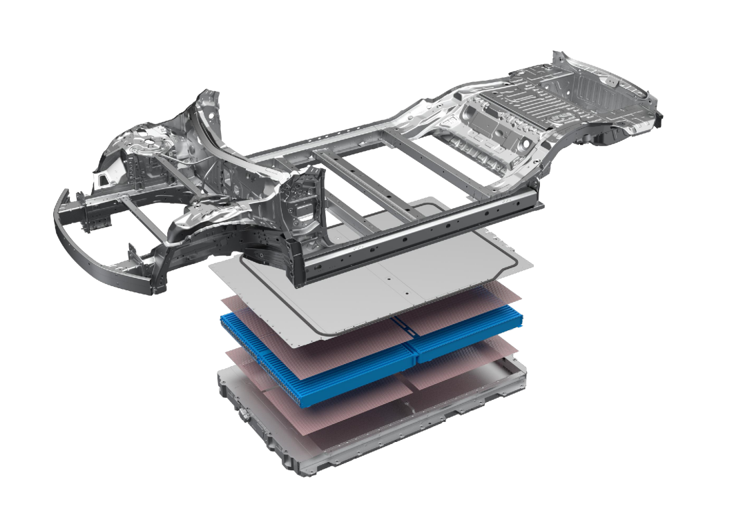 CTB技术以“电池车身一体化”为核心设计理念,并且在“蜂窝”中找到灵感,结合刀片电池独有的长方体结构和超级强度,衍生出“类蜂窝铝”结构,带来电池成组技术里程碑式的革新,通过将刀片电池包与车身刚性连接,二为一形成完整体,将地板(电芯上盖)-电芯-托盘三者与车身集成,形成高强度的“整车三明治”结构。