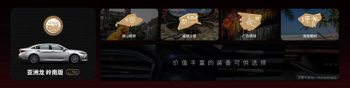 此外,丰田官方还在臻选版车型的基础上推出岭南版车型,并且特地为南部区域的用户推出了广西绣球、福建土楼、佛山醒狮以及海南椰树等具有岭南地域特色的专属标识可供选装,极具中国文化特色元素。