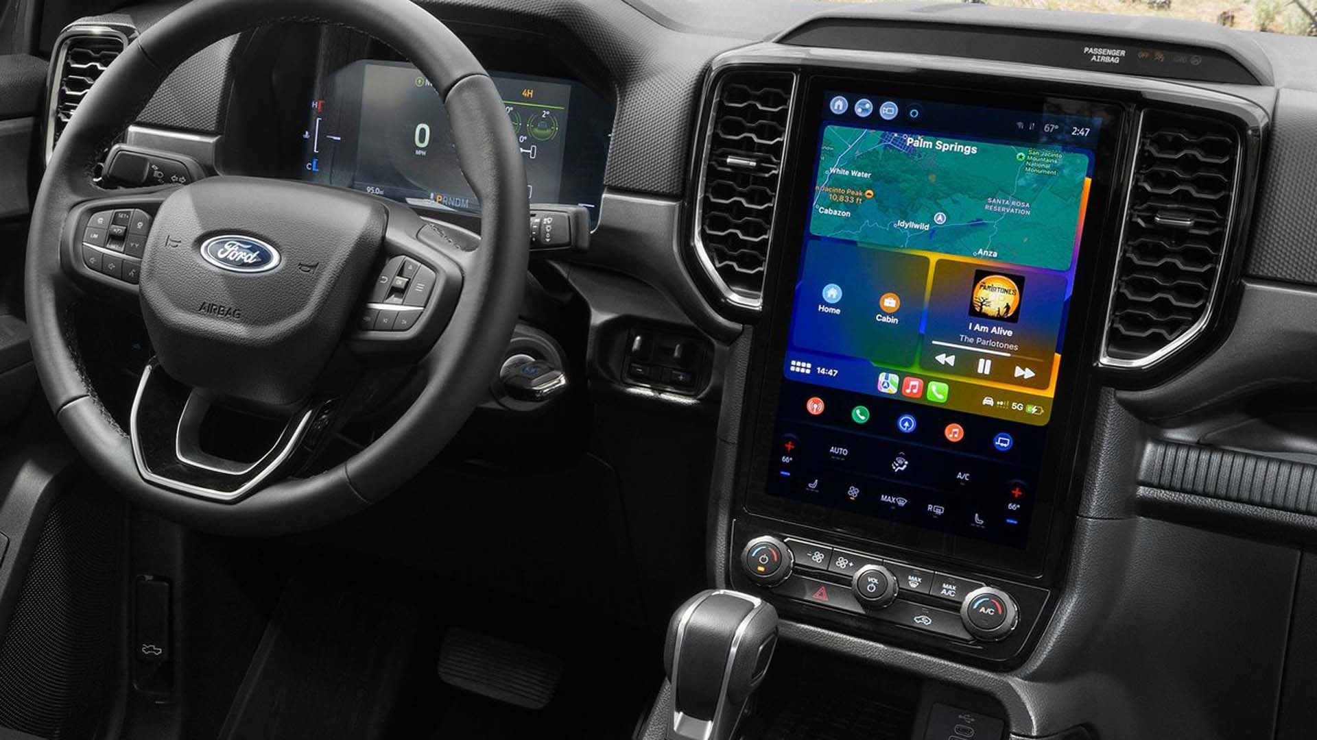福特Ranger在中控台上配备一快大尺寸的中控屏,在其下方还保留有部分常用的物理按键,但其功能也可以通过中控屏幕去调整,多样的调节方式,传统与现代化科技兼备。不仅如此,中控屏中还内置了最新的Sync4车机系统,既然是要引进到国内市场,它还专门进行了本土化调整,更适合国内用户的使用习惯。在细节方面,车内除了配备usb充电接口外,还新增了无线手机充电面板。