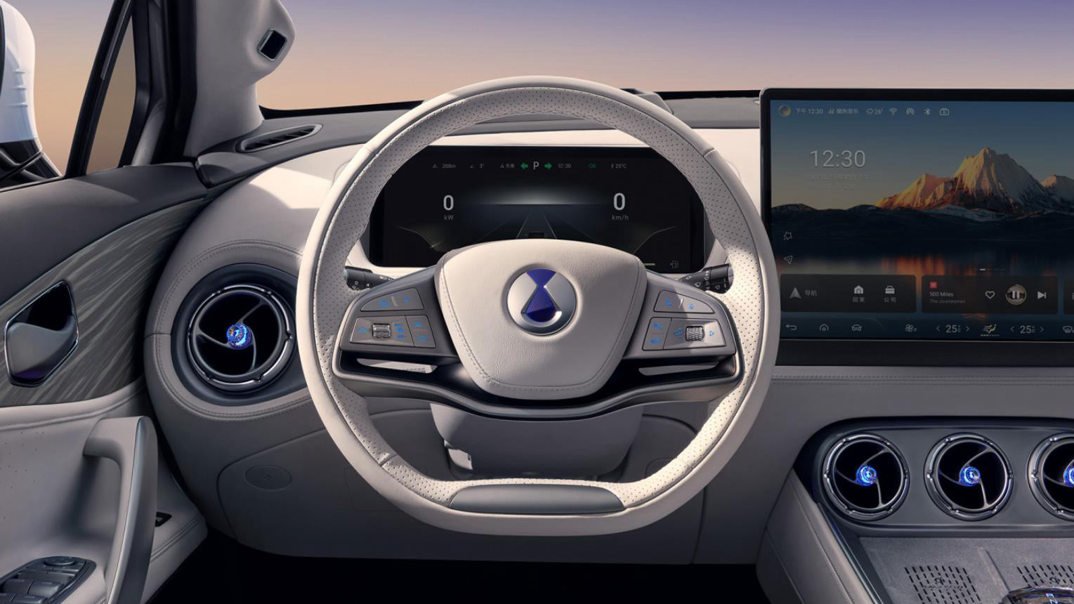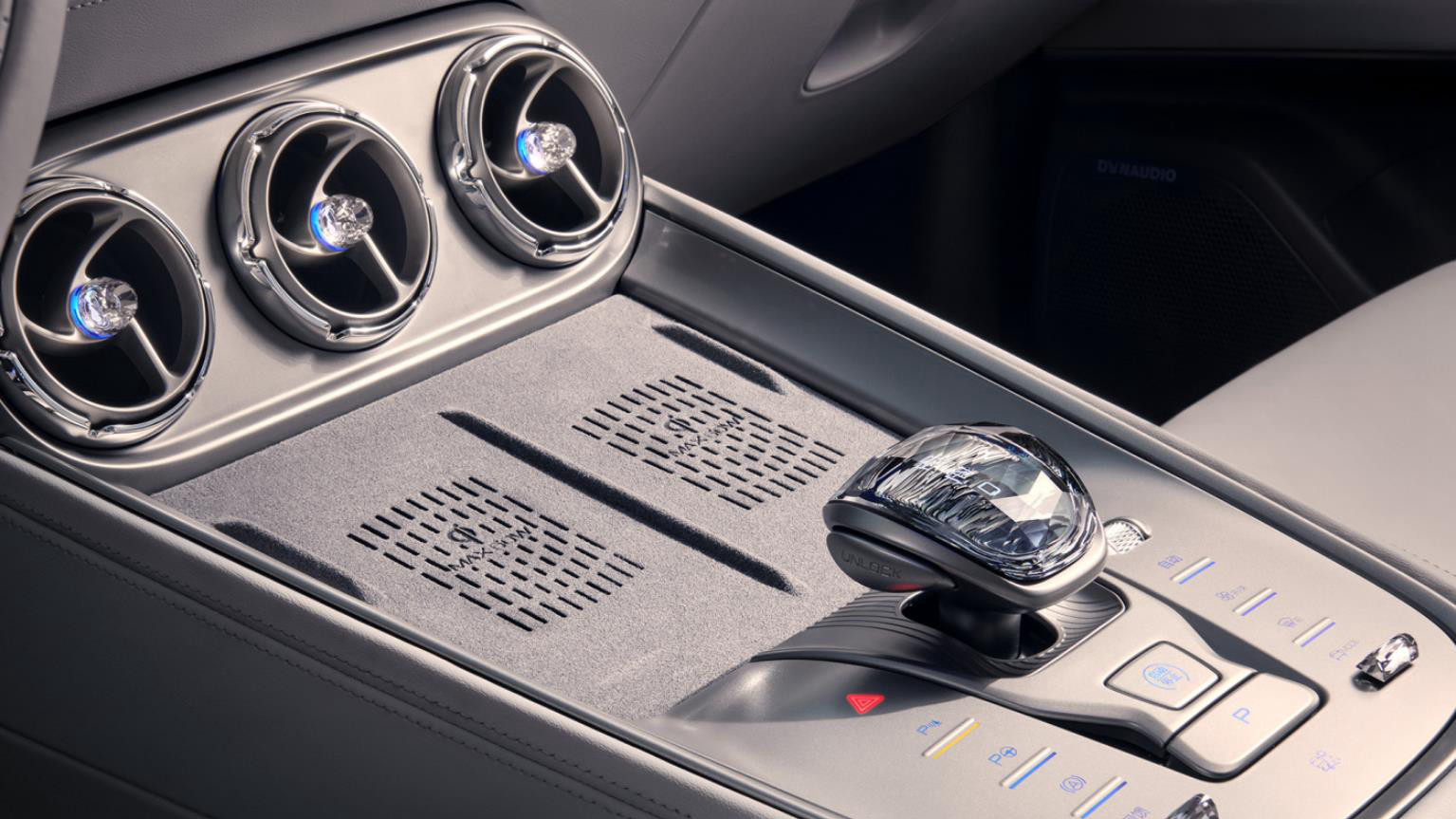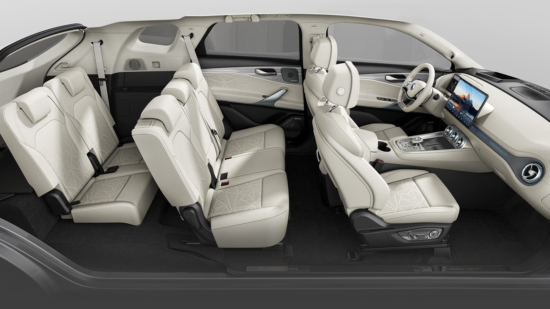 从表面上来看,腾势N8的中控台基本上就只有3块大屏、一条贯穿主副驾的银色饰板和两个空调出风口。