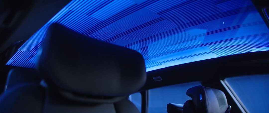 车顶处是大家见惯不怪的一体式玻璃天幕,玻璃上布满了可点亮的蓝色线条,充满科技气息。