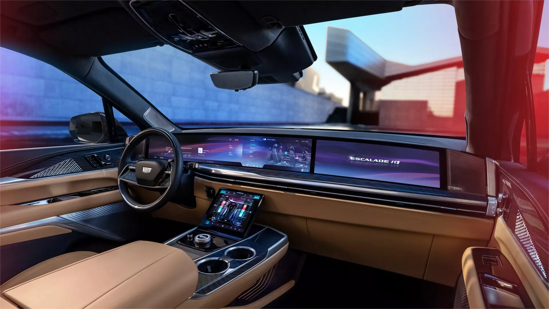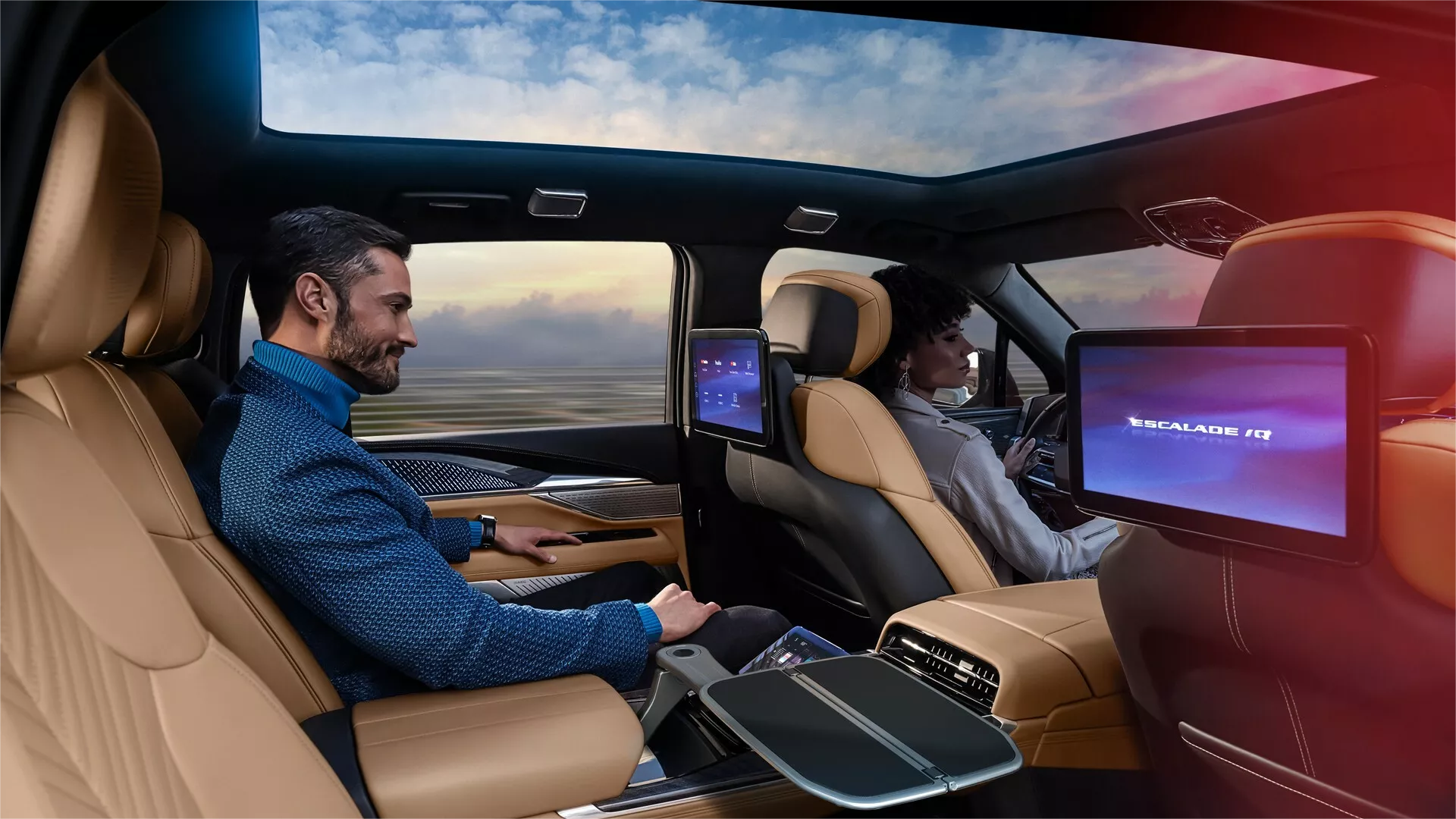Escalade IQ的马鞍台前方以及后排中央扶手前方分别配有一块用于控制空调系统、座椅功能的触摸屏,并且在主副驾座椅后方配备了为后排乘员服务的12.6英寸娱乐显示屏。