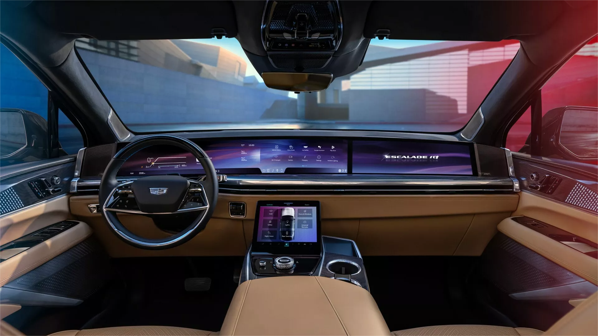 Escalade IQ的中控台上就配备了一组总尺寸达到了55英寸的贯穿式LED曲面大屏(仪表+中控一体屏+副驾娱乐屏),并且搭载了最新一代的高通智能座舱平台,提供了免提通信、实时交通、充电网络信息以及应用商店等智能化体验。