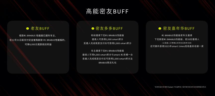 现场,全新配色smart精灵#1 BRABUS性能版正式上市,官方零售价为人民币284,900元,此次发售限量1,999台。同时,为回馈广大密友的热爱,smart还同步准备了老友BUFF、密友多多BUFF和密友嘉年华BUFF。