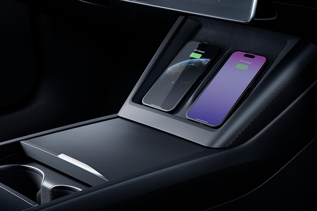不过真正值得关注的是在功能层面的变化,改款后的Model 3将会提供通风座椅和最多可达17个扬声器的环绕声音响,前排手机无线充电座也升级至两个,后排乘客也获得了独立的8英寸触控屏以控制空调、播放影音素材等。