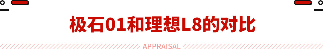 而在动力系统上,极石01同样做了针对性极强的设定。和L8一样,它也是增程式,而且无论是电池容量、WLTC纯电续航里程还是综合续航里程上,极石01都要比L8稍微好一些。不过说到价格,这里就很有看头了,极石01的指导价为34.99-35.99万,两个版本,相比指导价为33.98-39.98万,三个版本的理想L8来说,它的最低价更高但最高价更低,那么,既然极石01是完全针对理想L8而来,那么这两款车对比一下会如何?