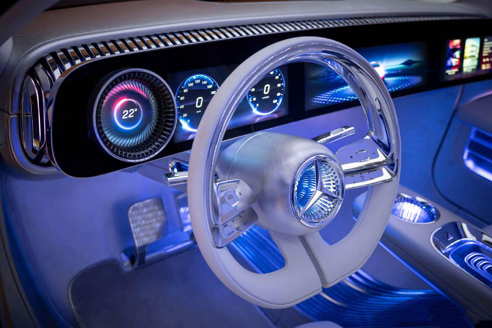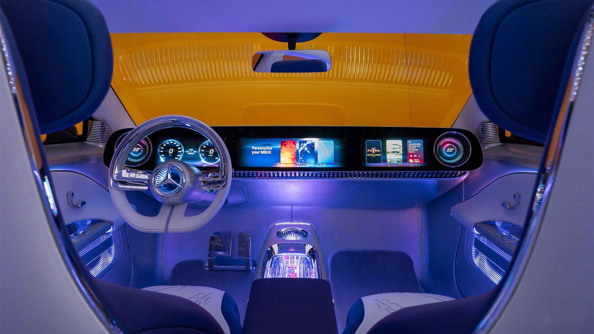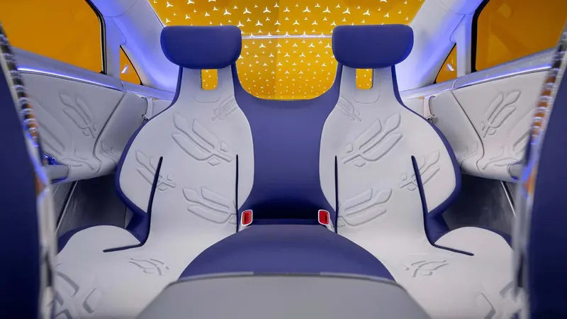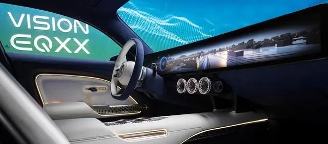 内饰方面,奔驰CLA概念车大量参考了此前EQXX概念车的设计,一体式大连屏外加大量环保复合材料的使用,十分契合新能源的主题,并与外观方面保持一致的科幻主题风格。