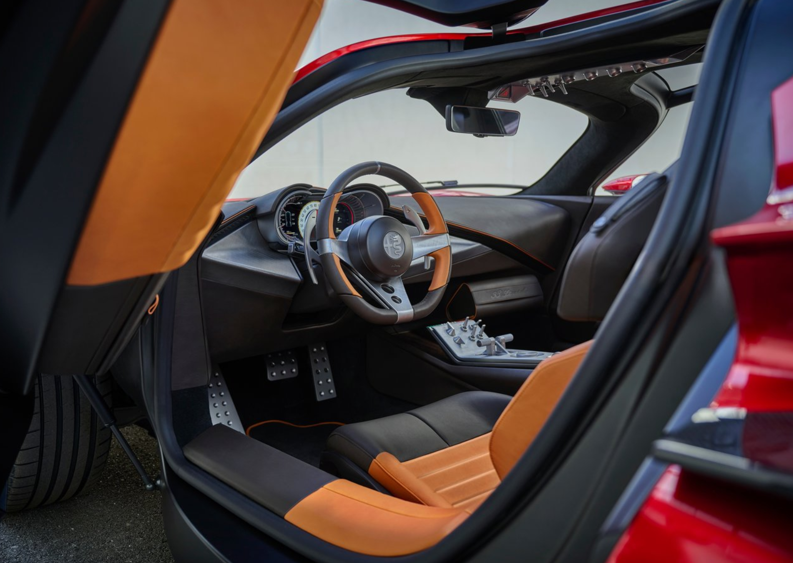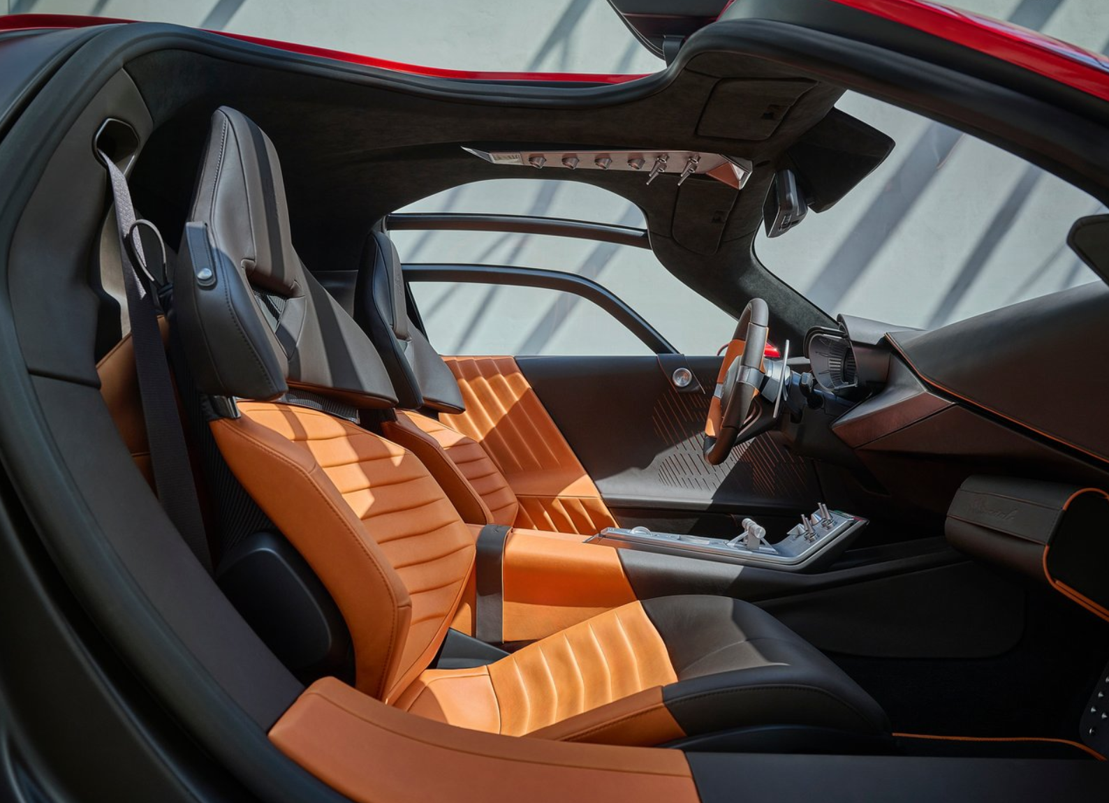 最为明显自然是其采用致敬旧款33 Stradale的金属元素,因为除了中控、方向盘上以及换挡机构都由金属材质呈现,车顶也加入类似飞机座舱的拨杆式造型,复古感极为强烈。