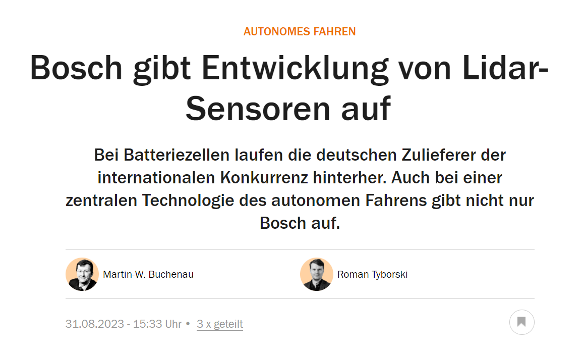 然而,3年之后的2023年9月4日就有外媒报道称,博世已经秘密退出了激光雷达传感器的研发,并且这一报道已经得到了博世发言人的证实。博世发言人称:“考虑到技术的复杂性和上市时间,博世不久前就决定不再在激光雷达传感器的硬件开发上投入更多资源。”