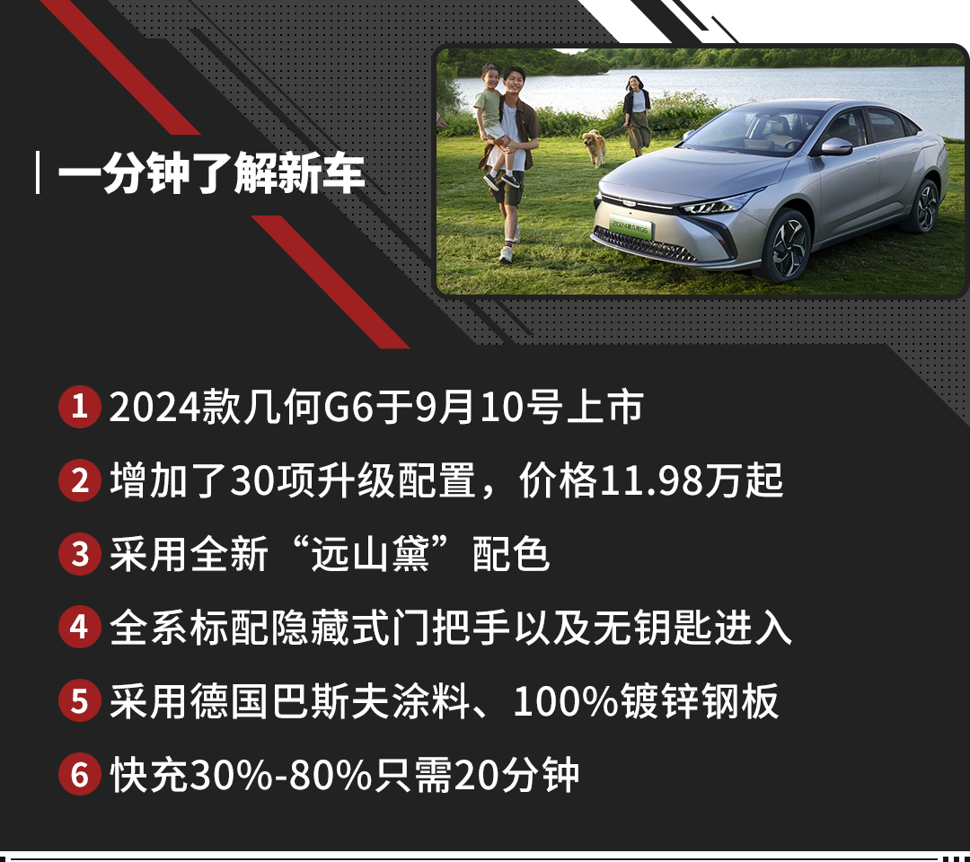 动力方面,2024款几何G6新增的100kW电机最大效率为95.7%,集成度高,传动效率高,而且NVH性能更好,电池有46.11kWh和53.4kWh可选,续航分别为410km和500km;低功率电机最大功率100kW,最大扭矩180N·m;高功率电机最大功率150kW,最大扭矩310N·m,零百加速只需6.9秒,并且使用快充可以在20分钟从30%充到80%,真正做到充电8分钟续航100km。
