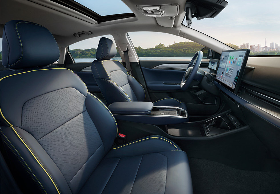 2024款几何G6采用环抱式座椅,减少了行驶过程中乘客的左右晃动,搭配黄边点缀,让车内空间不单调。并且得益于全新采用的CTP电池包,让后排地板中央平台变得不那么高,基本达到了全平的状态,此举也是改善了中间乘客的乘坐体验。