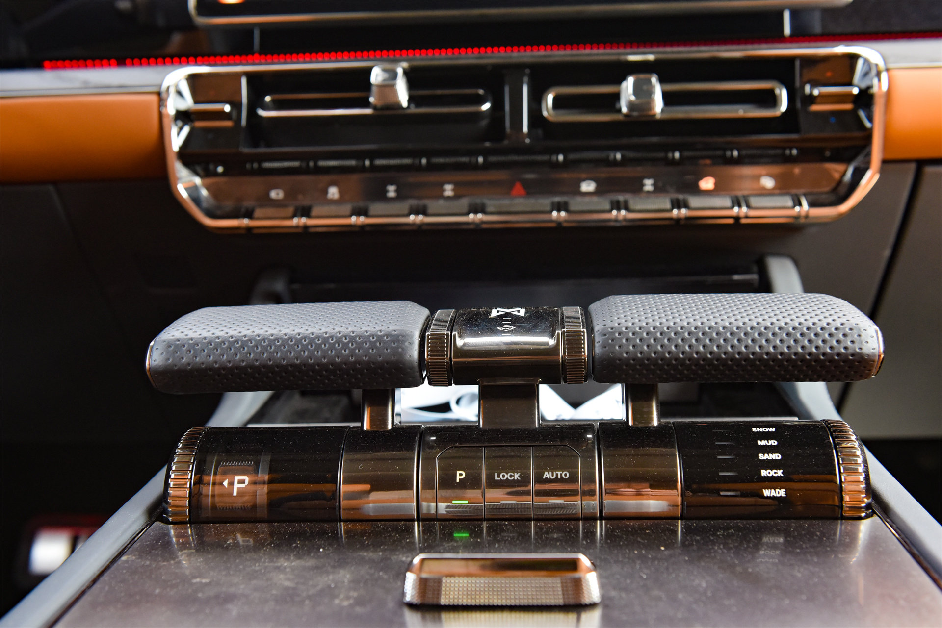 例如它的油门刹车踏板,做得比同级很多车都要宽大许多,这是为了满足人们在重度越野时,穿着重型登山鞋或靴子时开车用的。再比如中控台上那个巨大的,像飞机节流阀一样的巨型“换挡杆”,这个机构其实集中了猛士917最核心的控制模式。这个结构从左到右分为三个控制区域,最左侧的是换挡杆,在P挡状态下前推是R挡后拉是D挡,和绝大多数其他车的逻辑一致,P挡则被放置在了整个“节流阀”的中央位置,是一个独立的按钮。