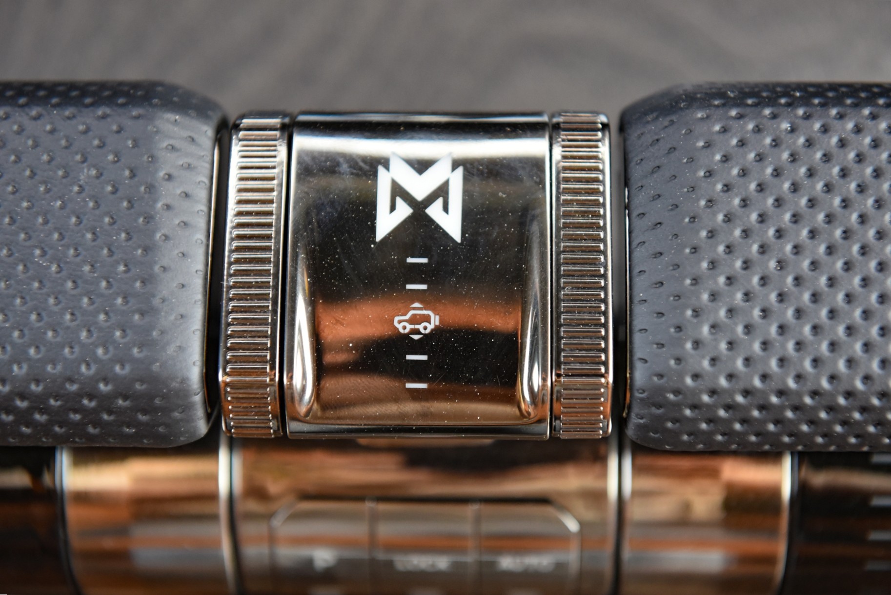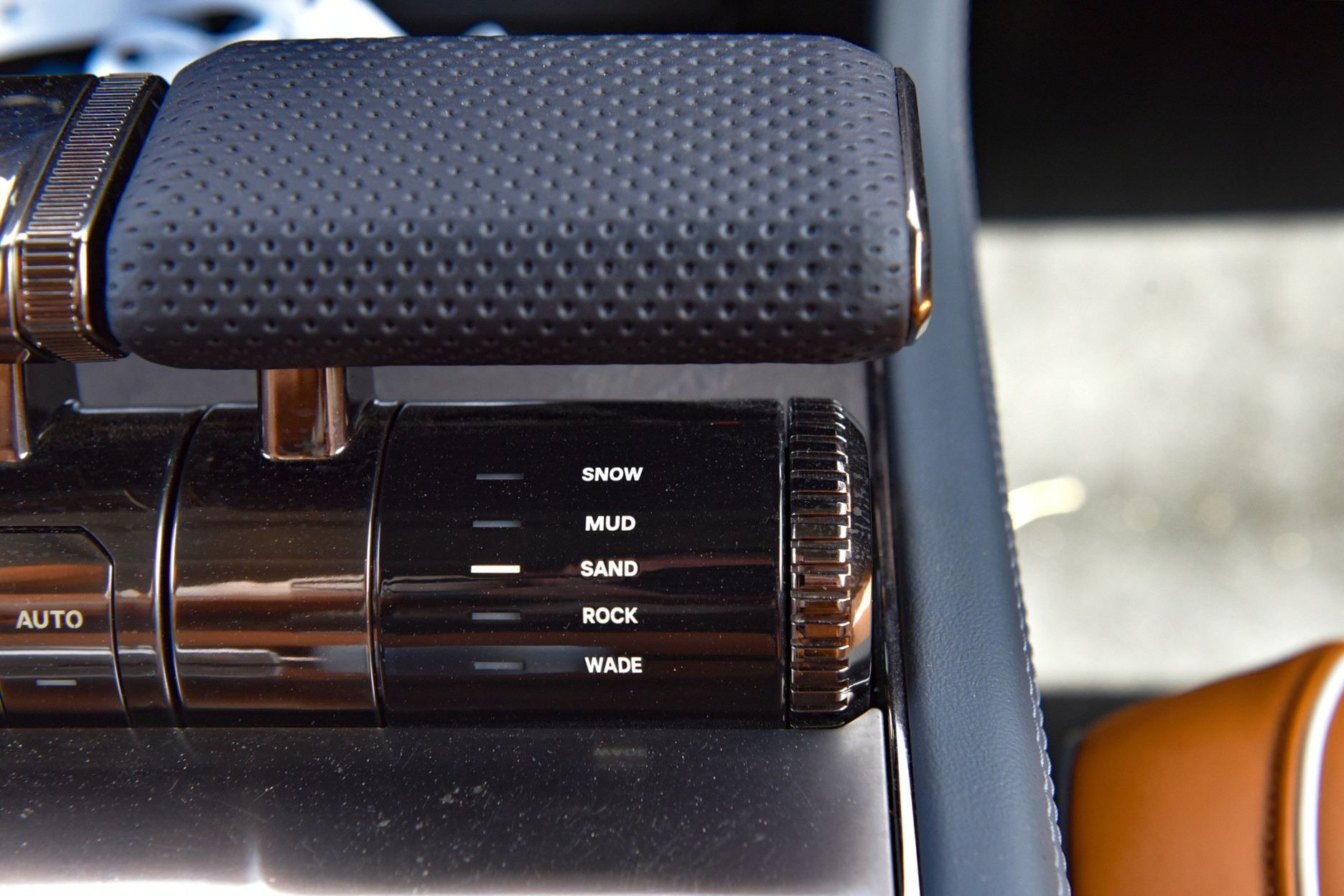 “节流阀”中央的,带有猛士LOGO的东西是空气悬挂的高度调节。猛士917可以实现150毫米的空气悬挂调整幅度,这个150毫米是什么概念呢?