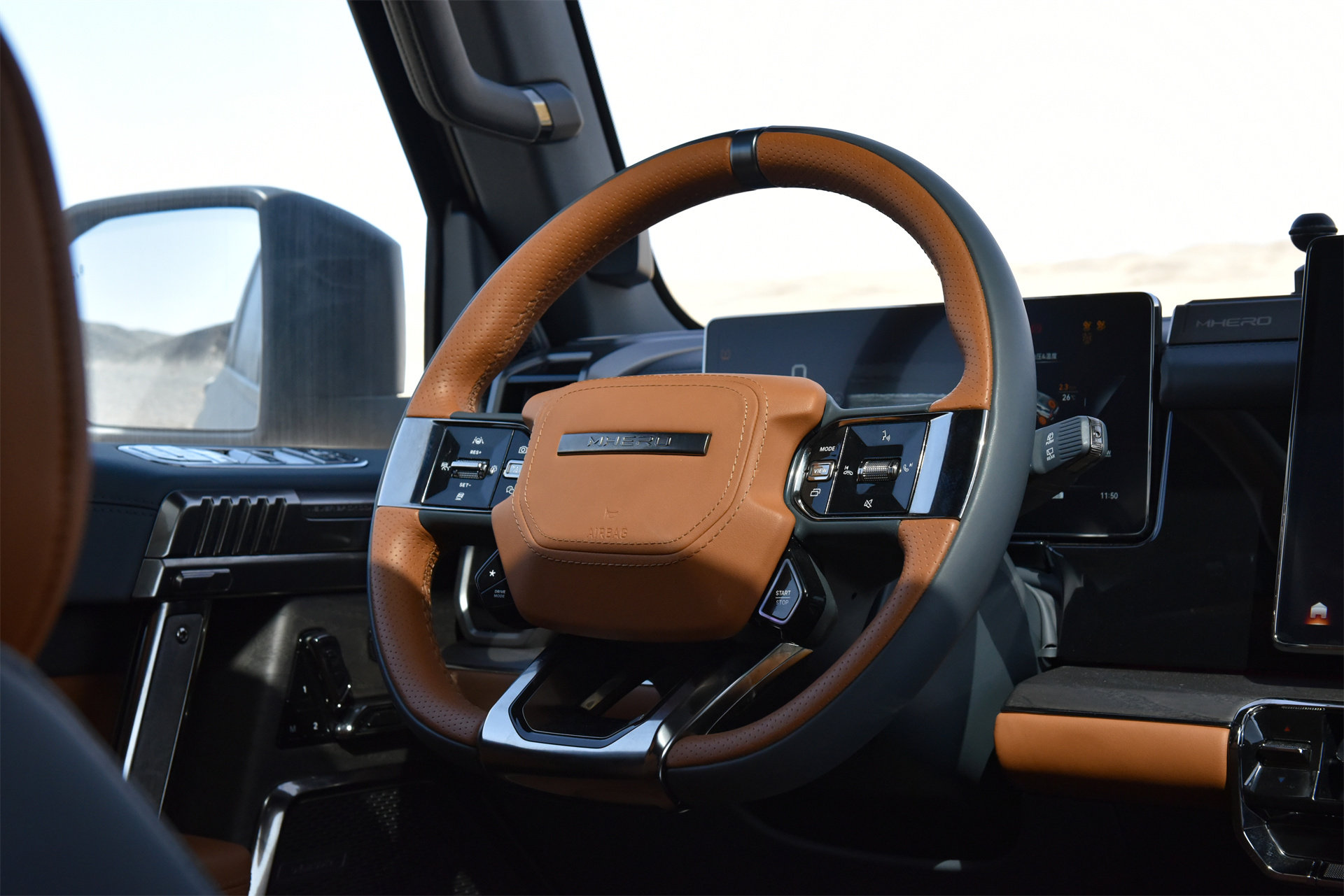 如图所见,这个内饰基本上能满足你对于一台这个级别豪华SUV该有的全部印象。整个内饰到处都是高级皮革覆盖,除了皮革之外就是闪闪发光的,被抛光得非常好看的不锈钢材质。当然了,和它的外观相匹配的是,猛士917的内饰也有不少能展现硬派风格的细节。