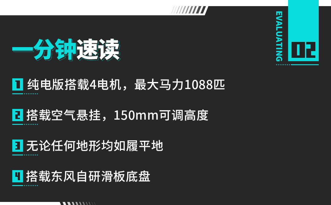 首先必须跟大家清楚说明的一个事实是,现阶段部分舆论认为,猛士917用的就是军版三代猛士的底盘,这个是不对的。根据东风猛士给我们的官方资料显示,猛士917用的是东风自己研发的纯电滑板底盘,有纯电和增程两种动力形式。换句话说,它是一台完完全全的新能源车。而军版三代猛士的底盘因为涉及到保密需要,不会,也不可能会被应用到任何量产车当中,因此猛士917和军版三代猛士,底盘上是完全不同的。