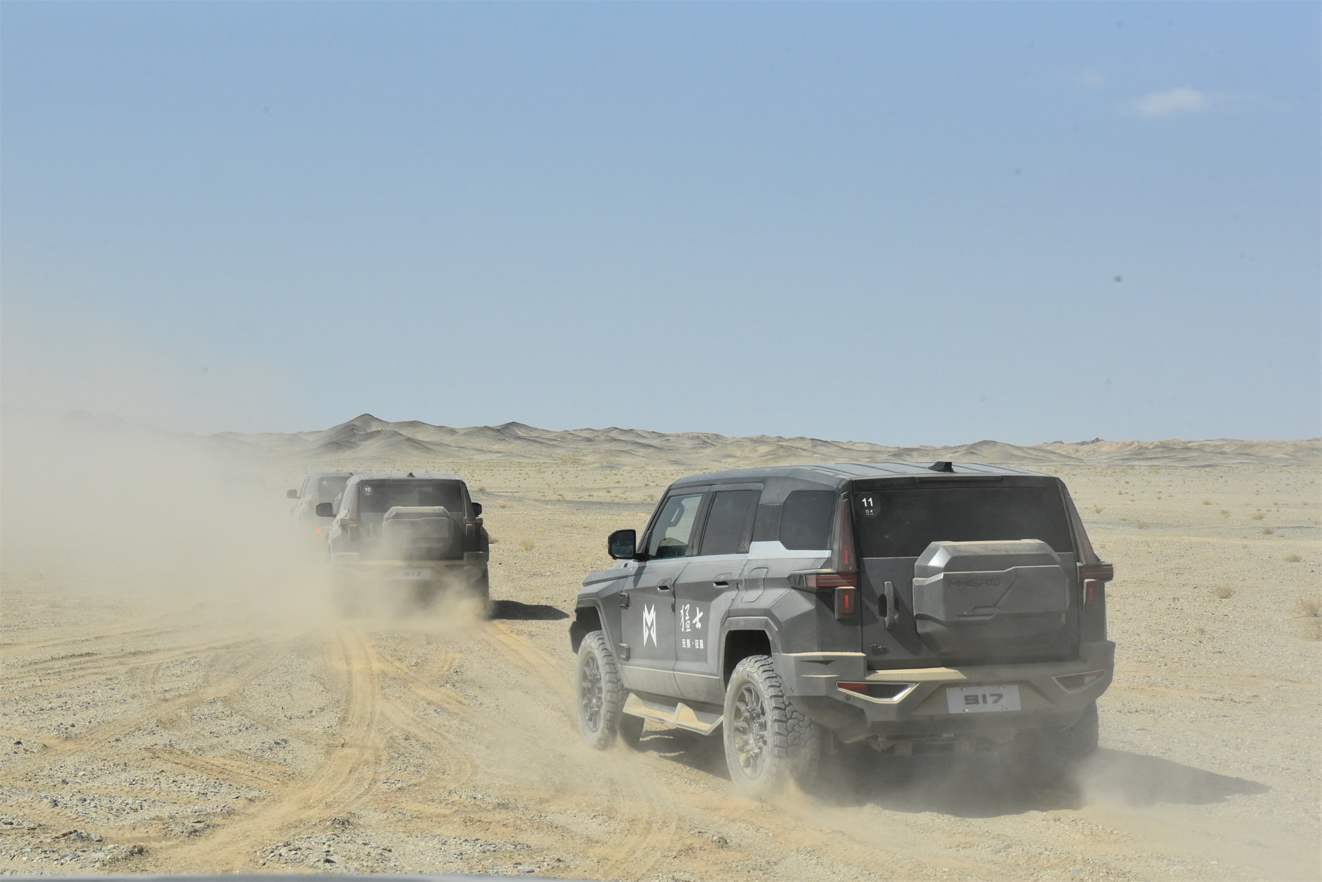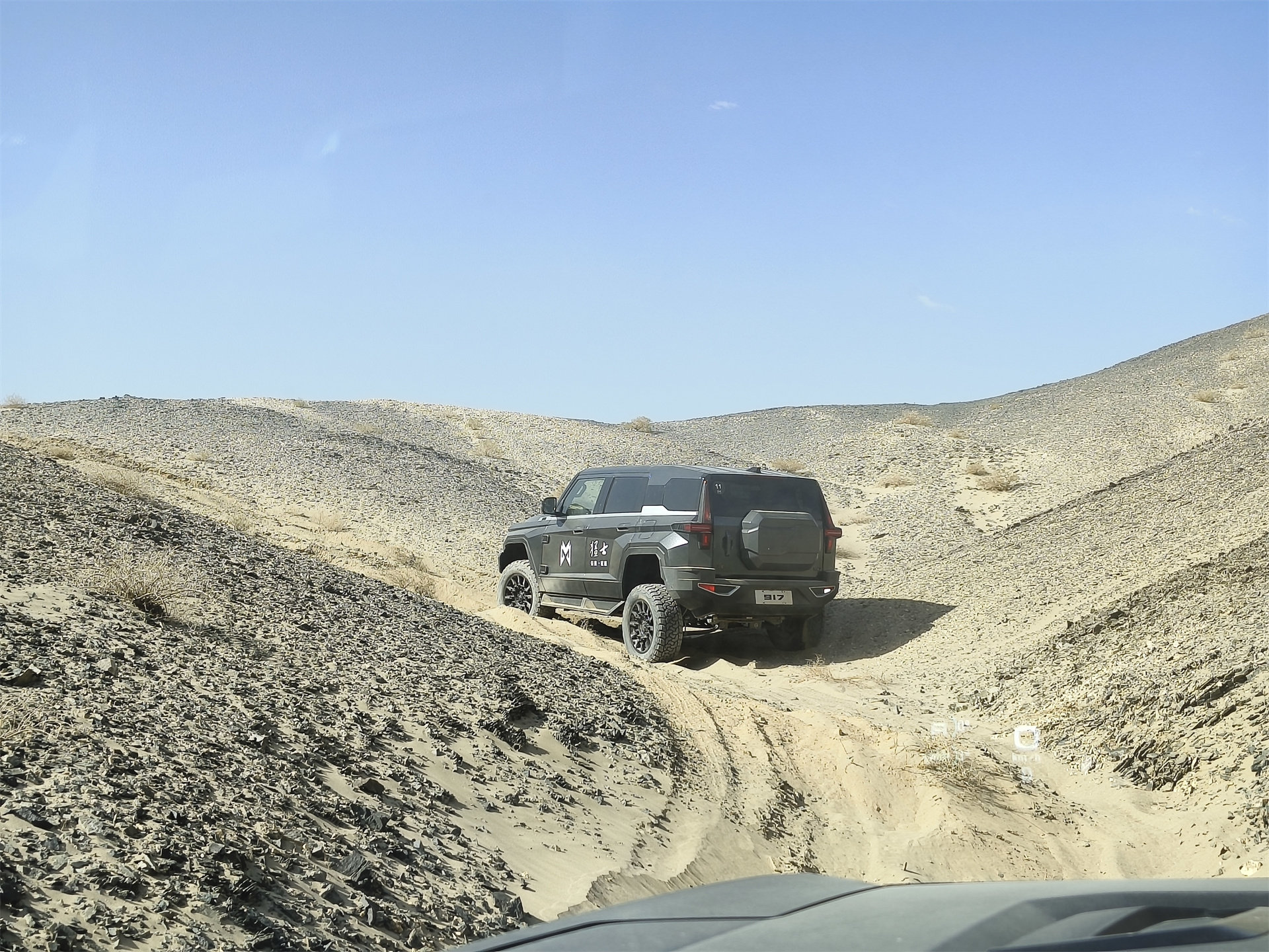 是真的如履平地,有很多你看着都心里发慌的场景,例如干拔沙山,你甚至都不需要大油门,只要轻轻踩着油门,感受车辆的动态,这台车就能很神奇地,用30-40公里的超高速度稳定地冲上沙山。而且你哪怕在紧接下来的下山中完全不减油门(冲沙山绝对不能刹车,这是大忌),猛士917也会凭借着陡坡缓降系统和自动启动的强能量回收模式(起到刹车的作用),帮助你非常安全地,非常写意地下山。