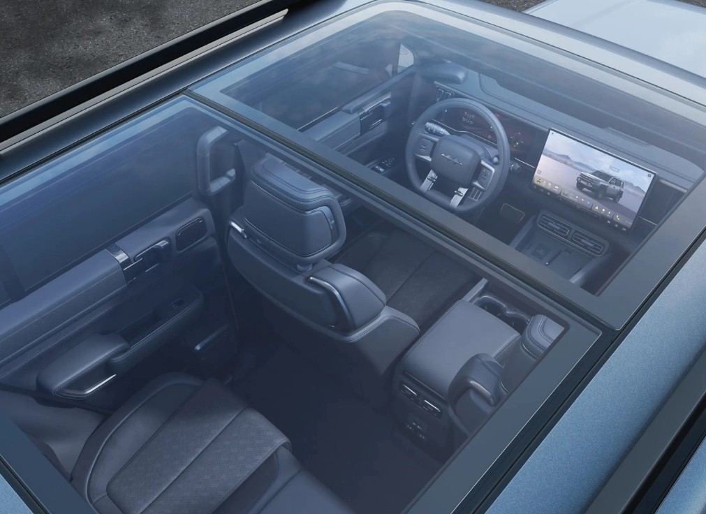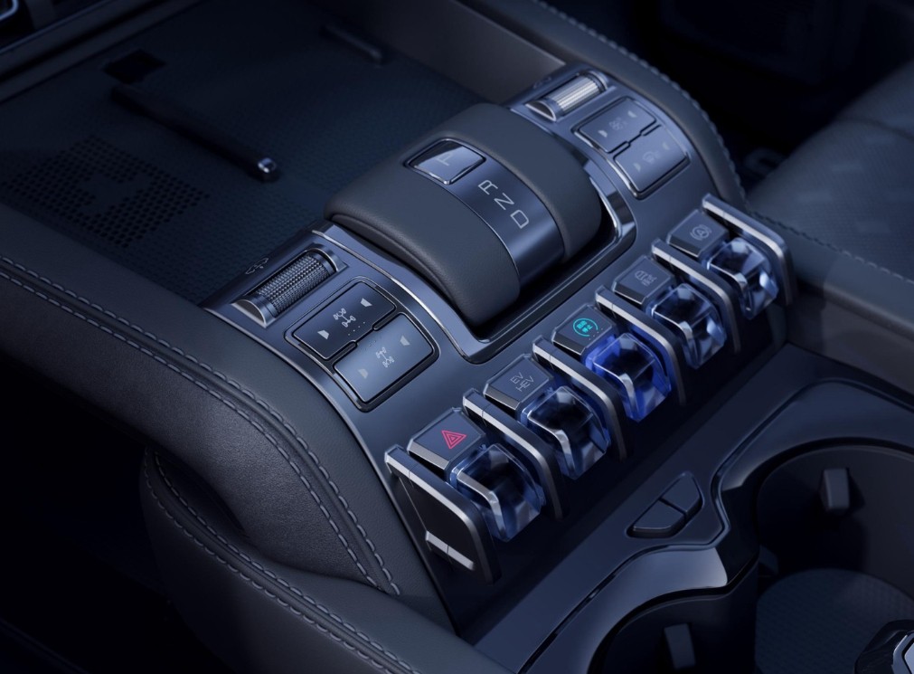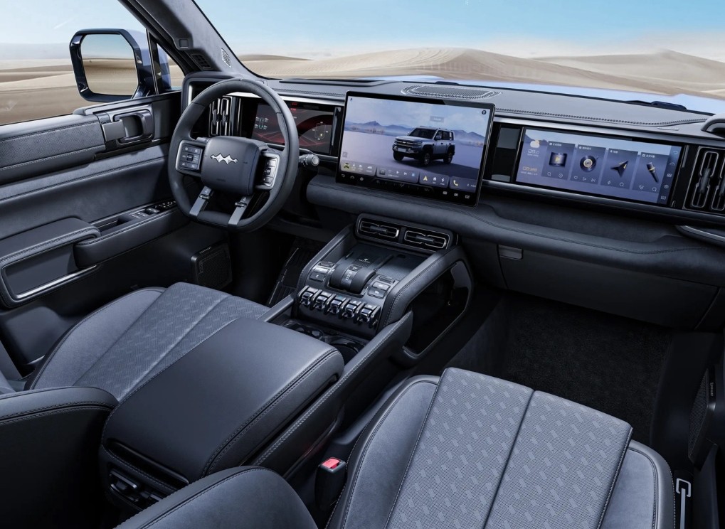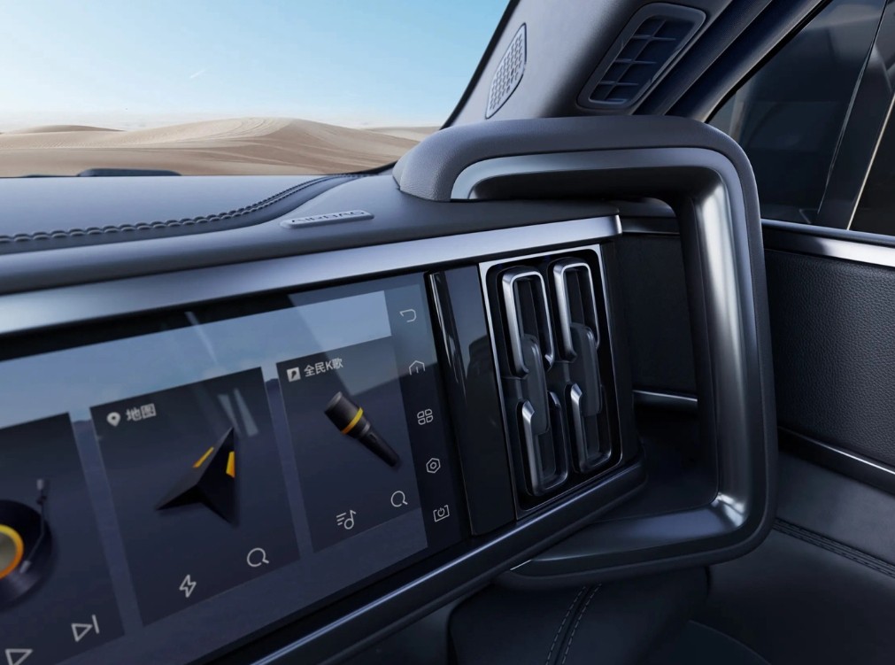 中控台的设计非常有意思,整体的布局神似车头部分,两侧的空调出风口处设计了硕大的把手,形成类似车头大灯的样式,而马鞍台的设计有点类似飞机操控台,各种实体按钮整体排列在可升降的档杆后方,前方则是50W的手机无线充电板,值得一提的是,前后差速锁采用了实体按键,便于日常使用;方向盘则是采用了类似我们最近看到的仰望U8的四幅式平底方向盘,多功能键下方两侧是模式选择滚轮。